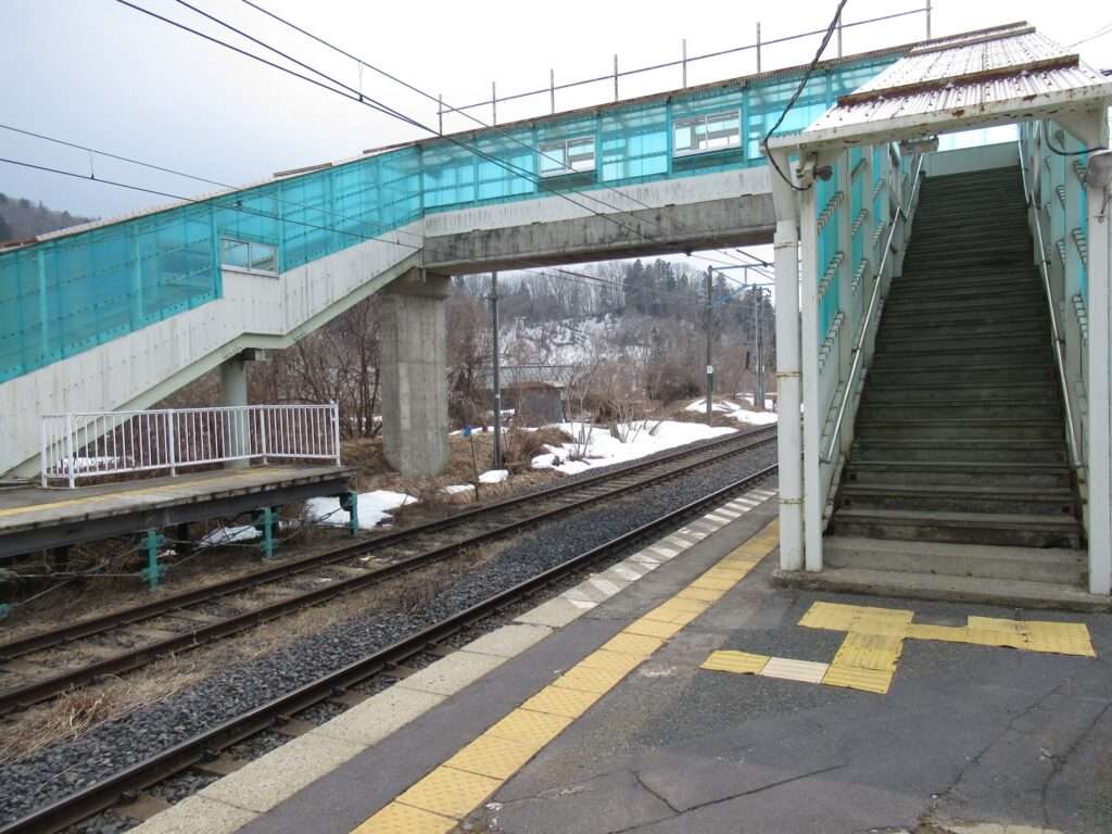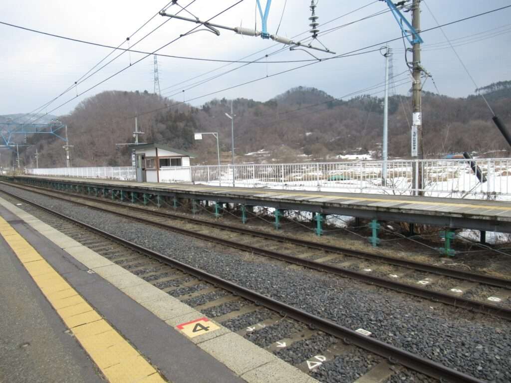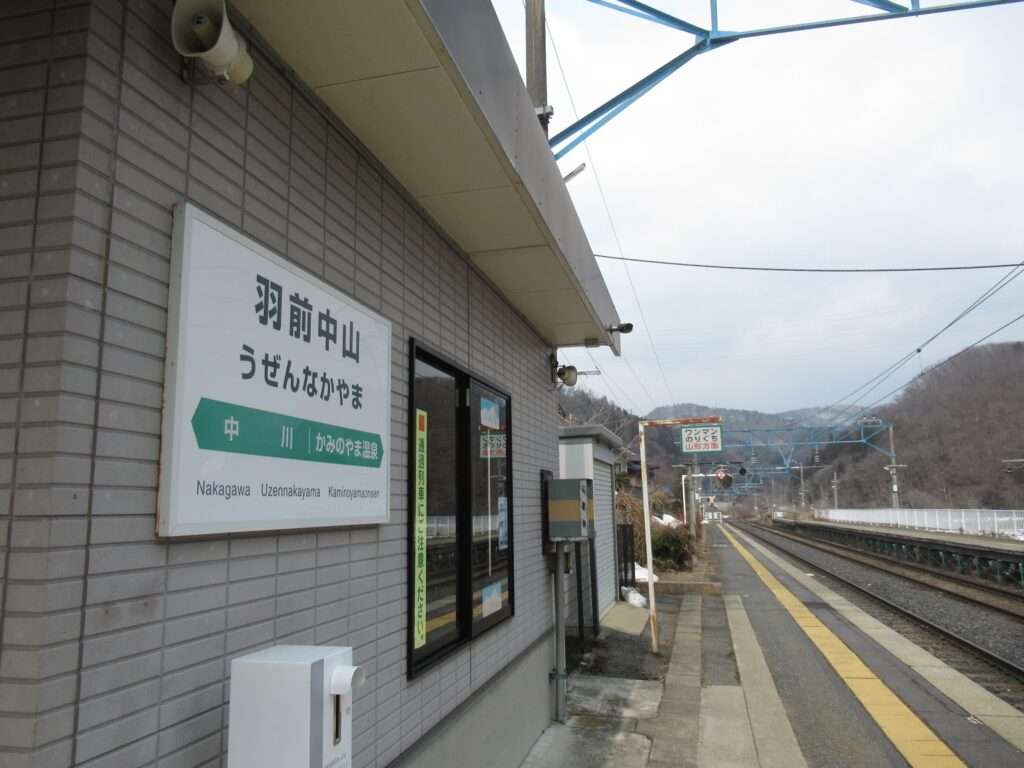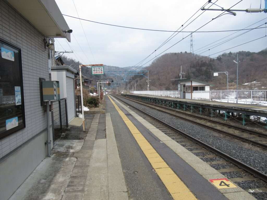 奥羽本線の羽前中山駅でございます。「山形線」の愛称区間に含まれております。ミニ新幹線である山形新幹線が走行する、米沢方面が単線、山形方面が複線となる電化区間にある列車交換可能な相対式2面2線の地上駅で、簡易な駅舎がある無人駅となっております。ホーム間は上屋付きの跨線橋で連絡しております。