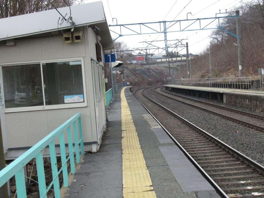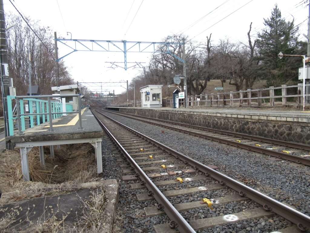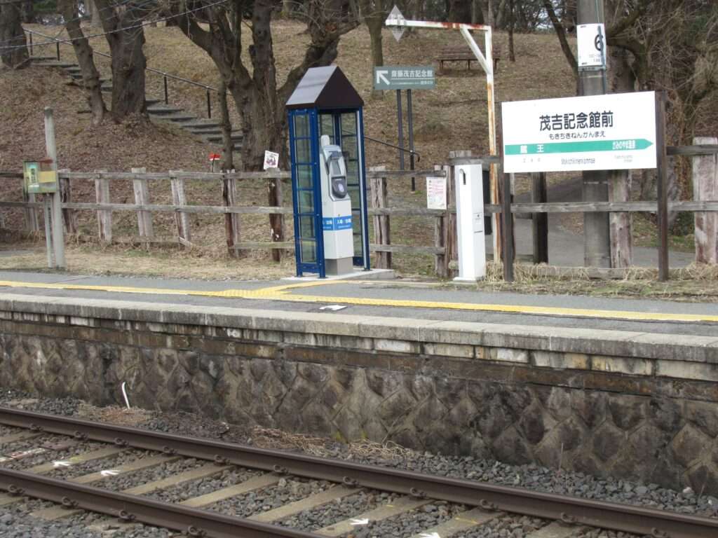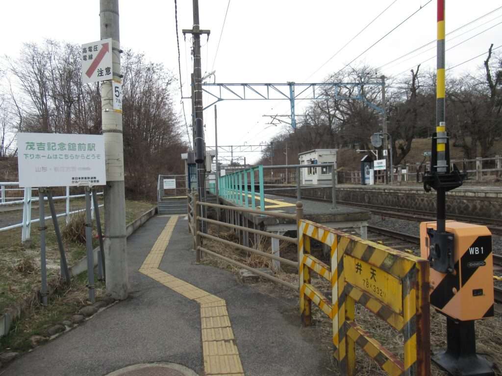奥羽本線の茂吉記念館前駅でございます。「山形線」の愛称区間に含まれております。ミニ新幹線である山形新幹線が走行する複線電化区間にある相対式2面2線の地上駅でございます。ホーム毎に出入口が分かれており改札内でホーム間の連絡はございません。駅舎のない無人駅で、ホーム上に待合所が設置されております。踏切脇からそれぞれのホームへ直接出入りする構造でございます。