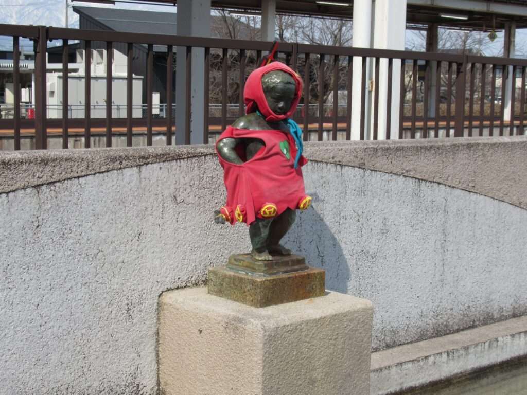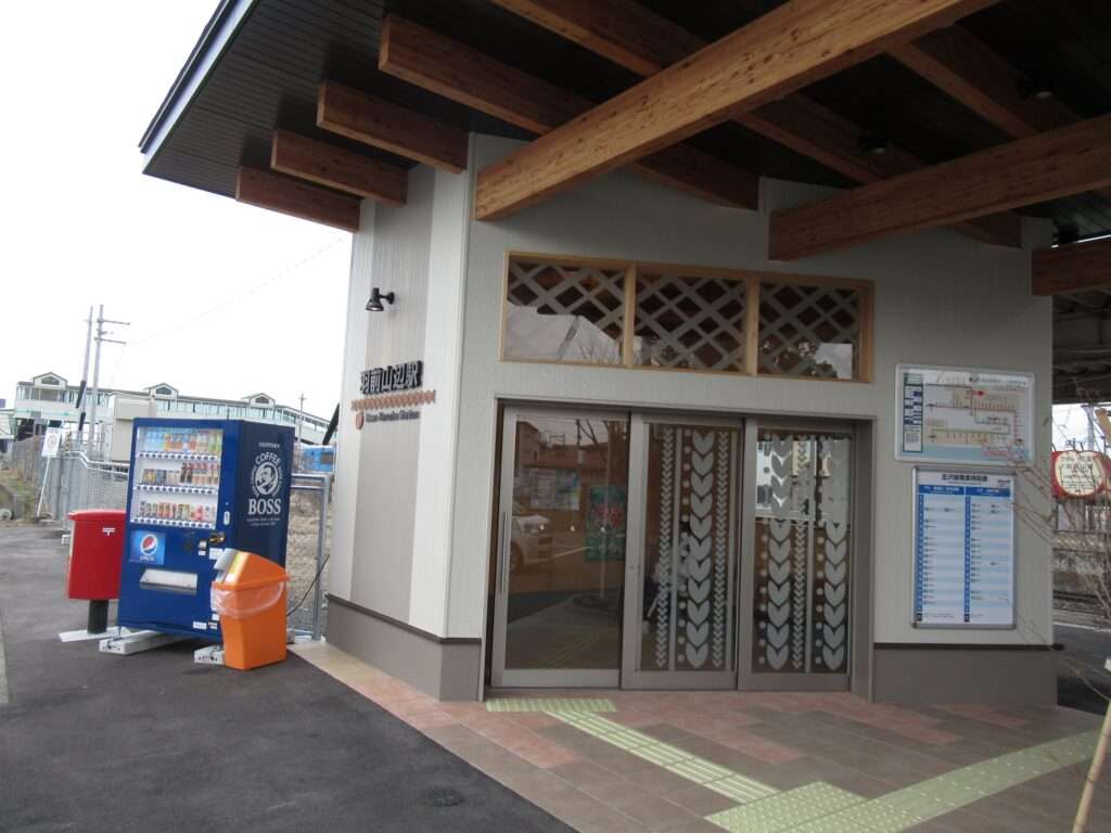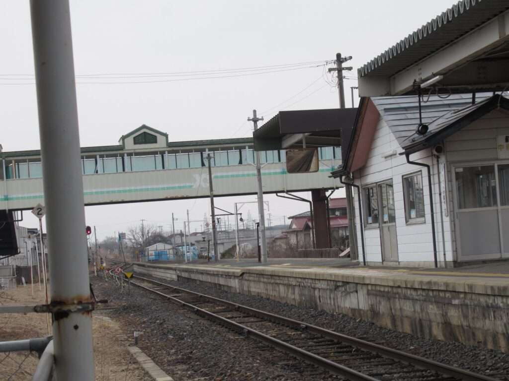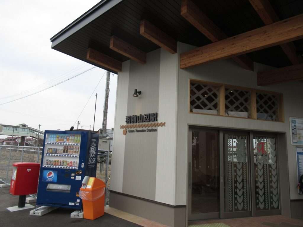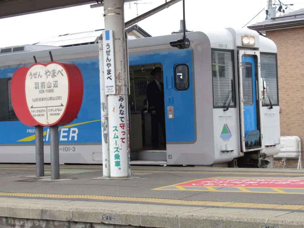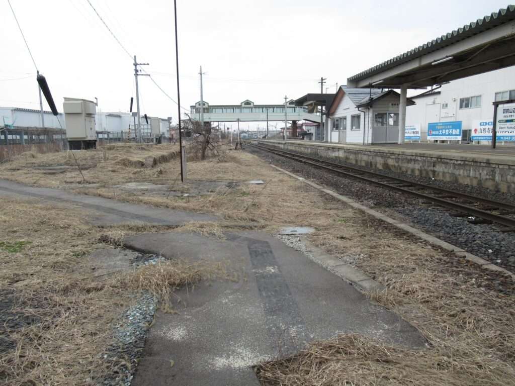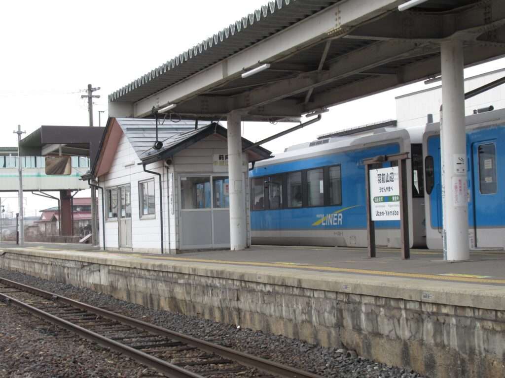 フルーツラインの愛称が付けられている全線単線非電化の路線、左沢線の羽前山辺駅でございます。列車交換可能な島式1面2線の地上駅で、簡易な駅舎がある無人駅となっております。駅舎とホームは上屋付きの跨線橋で連絡しております。山形県立山辺高等学校などの最寄り駅となっております。