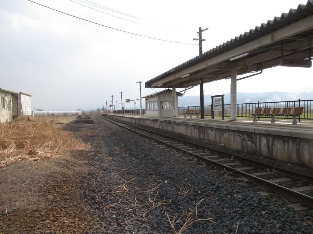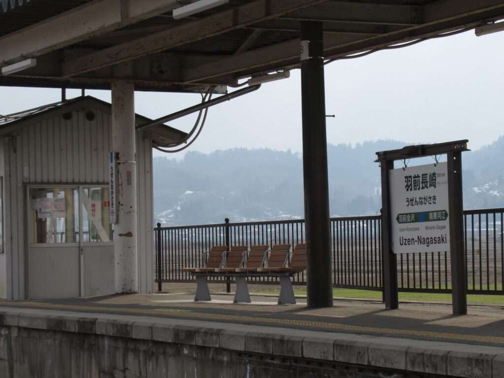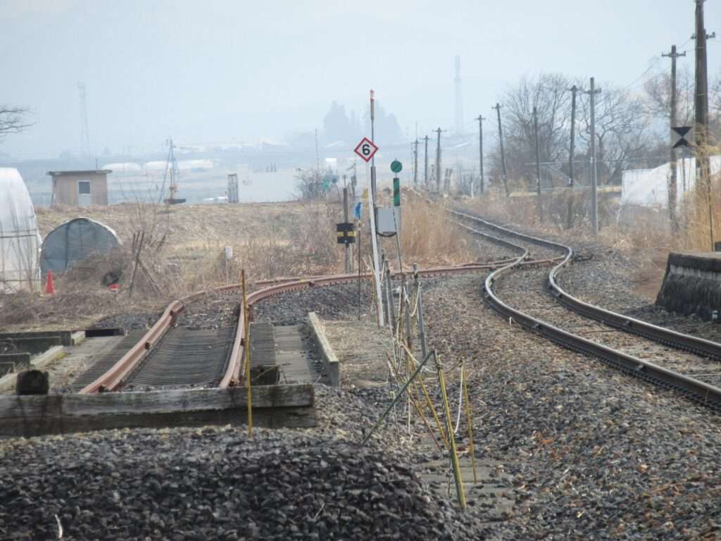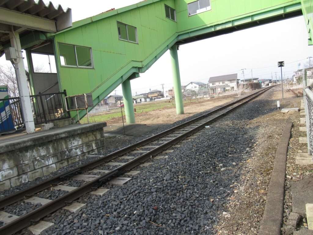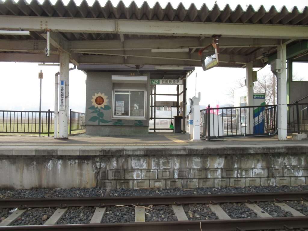 フルーツラインの愛称が付けられている全線単線非電化の路線、左沢線の羽前長崎駅でございます。かつては列車交換可能な島式1面2線だったうちの外側1線を廃止し柵を設けた単式1面1線の地上駅で、貨物取扱用ホームと引き込み線の跡が残されております。東側に待合室のみの駅舎がある無人駅で、ホームへは上屋付きの跨線橋で連絡しております。ホームから西側に出られる出入口も新たに設けられております。駅は中山町中心部から約1km離れた位置にございます。