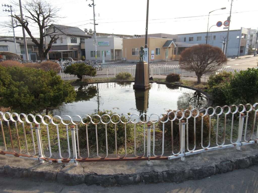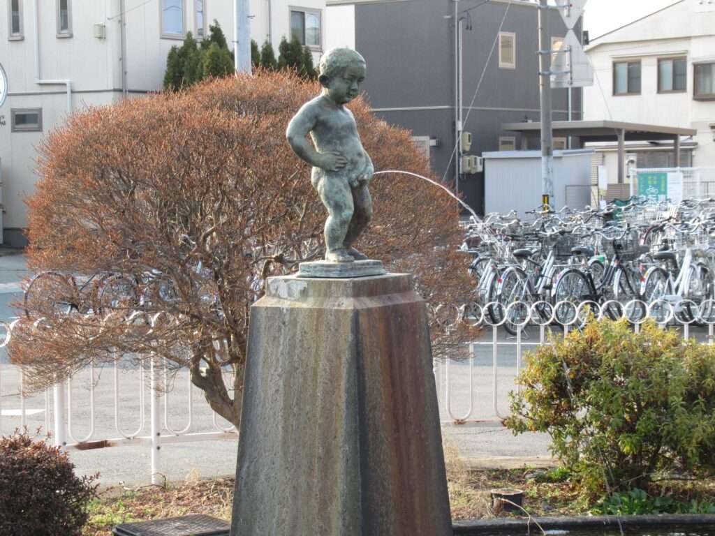 北山形駅東口前ロータリー広場中央部にある池には小便小僧クンが居ります。半世紀以上の長きにわたって服の着せ替えが行われていたそうですが、ワタクシの訪問時は服は着ていませんでしたですな。