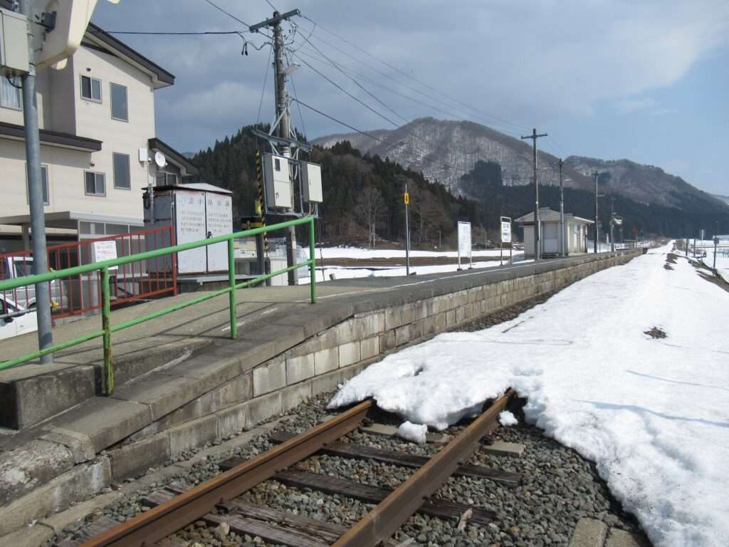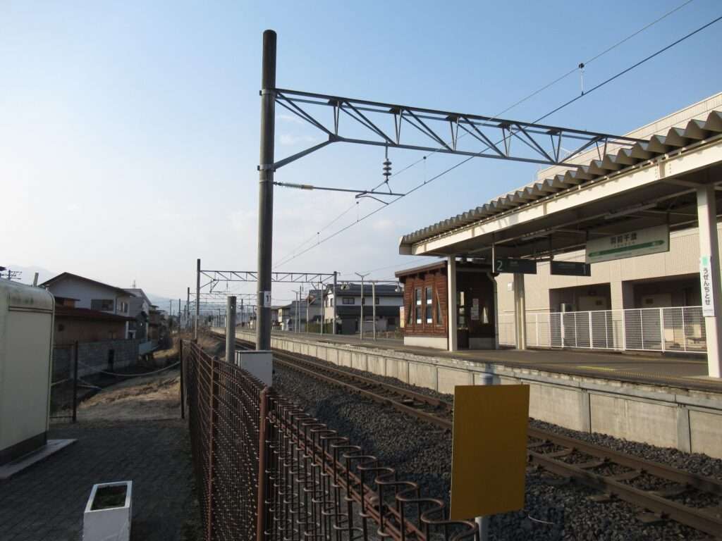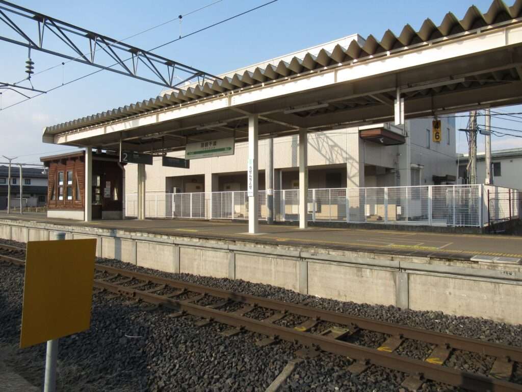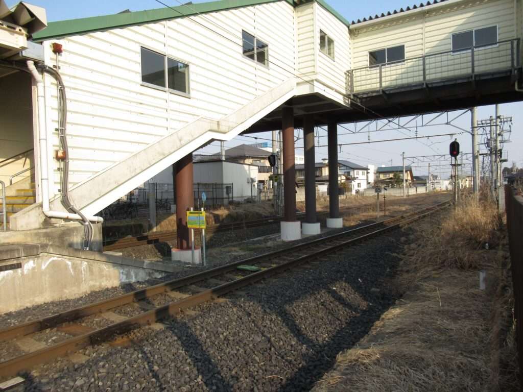 奥羽本線と仙山線の羽前千歳駅でございます。「山形線」の愛称区間に含まれております。山形駅まではミニ新幹線である山形新幹線が走行する標準軌の単線と仙山線の狭軌の単線が並列に配置されている区間にある島式1面2線の地上駅で、現在は駅舎のない無人駅となっております。東西の出入口を結ぶ自由通路の跨線橋の中に改札口がある橋上駅でございます。仙山線は路線書類上としては、ここが終点ですが、全列車が山形駅まで乗り入れいたしております。