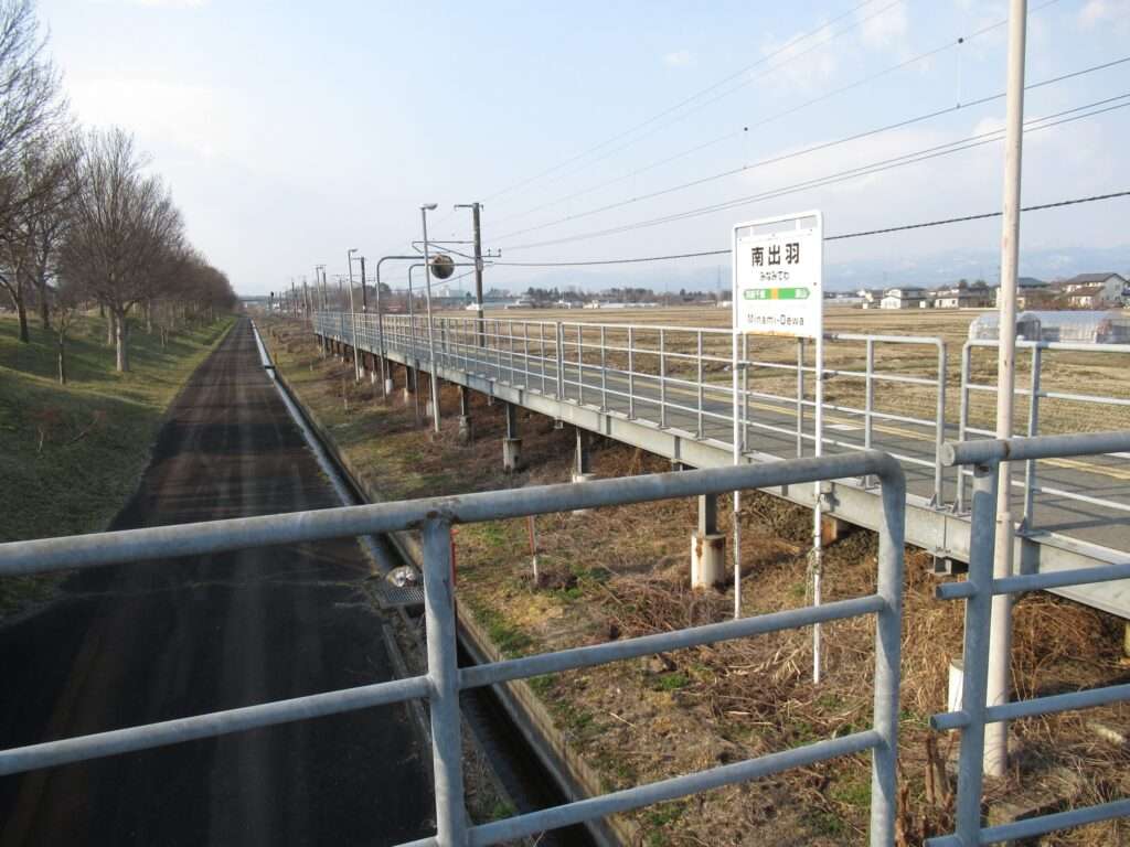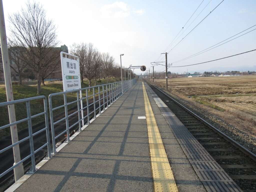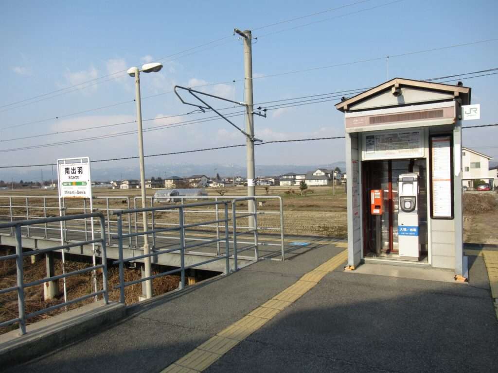 奥羽本線の南出羽駅でございます。「山形線」の愛称区間に含まれております。ミニ新幹線である山形新幹線が走行する単線電化区間にある地上駅で、単式1面1線の棒線駅となっております。駅舎がある無人駅で、駅前に山形県立中央病院が立地しております。