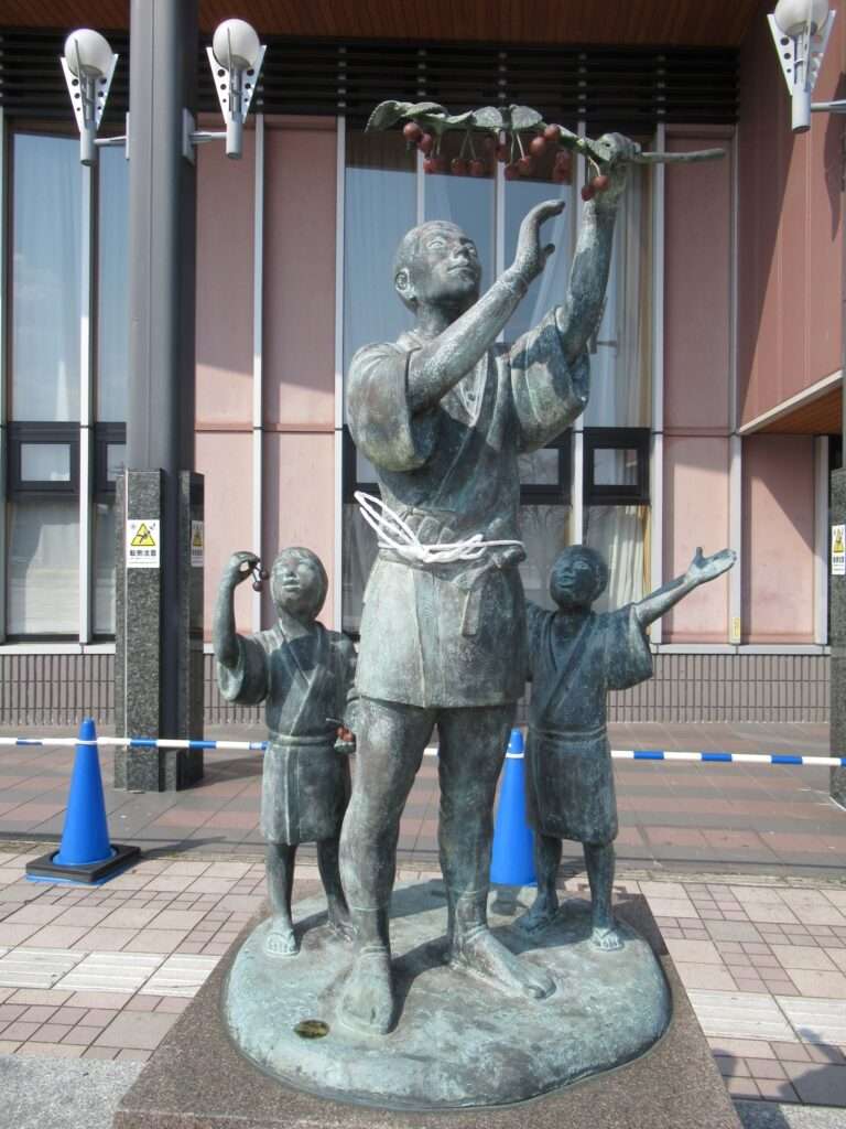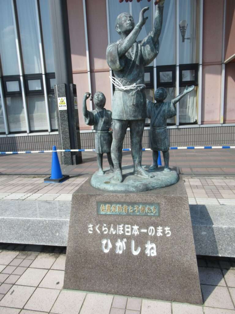 さくらんぼ東根駅前に建っている佐藤栄助翁と子たちの像でございます。佐藤栄助さんとは、さくらんぼの代名詞とも言われる佐藤錦を品種改良で生み出した人っすね、知らんけど(←知らんのかいw)。