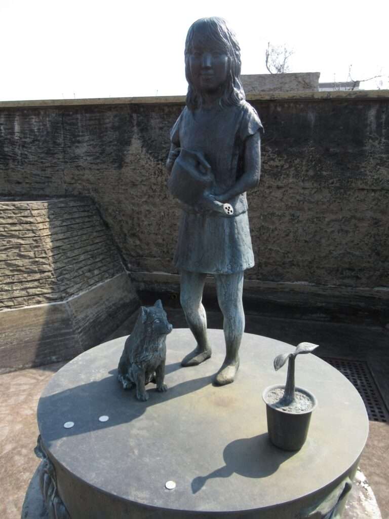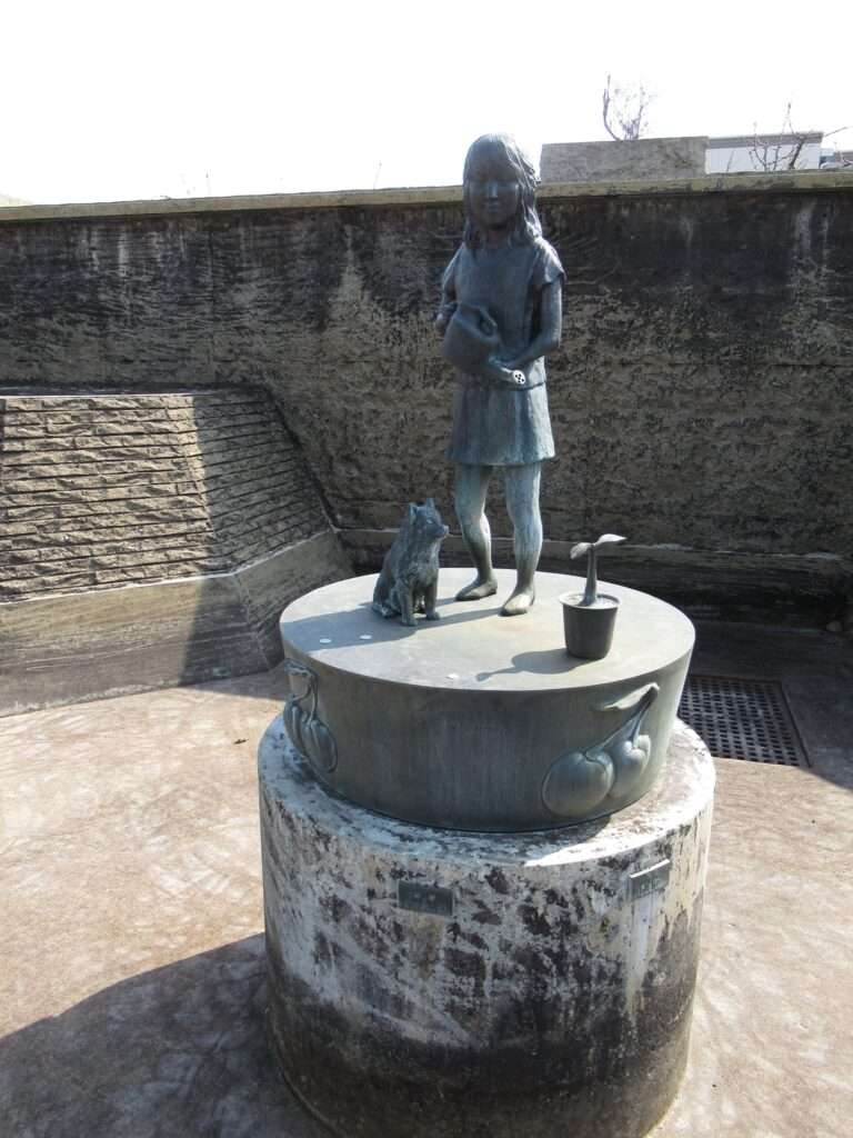 さくらんぼ東根駅前さくらんぼ公園に設置されている噴水池の中の像、「薫風」でございます。長谷川雅也さんの作品なんだそうです。