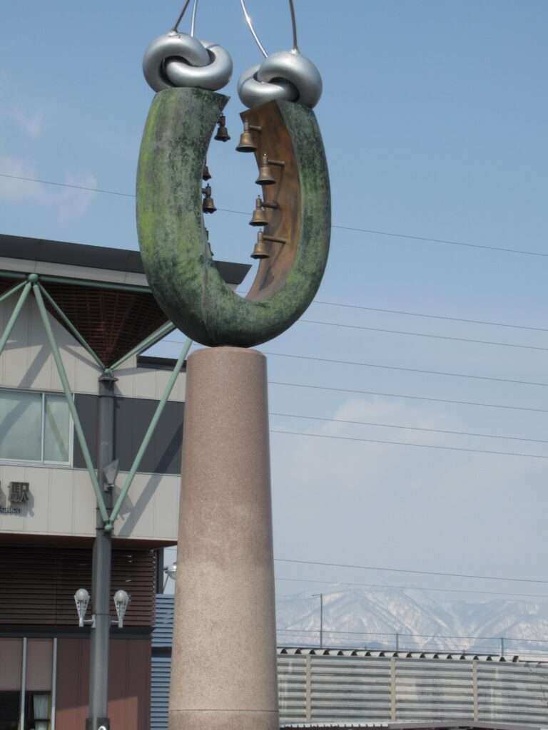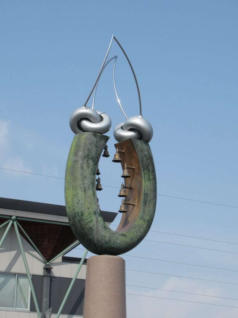 さくらんぼ東根駅前広場にある東根市制45周年記念モニュメント「和み」でございます。カリヨンになっておりますね。青木邦明さんという方の作品だそうですよ、そこの奥さん(←何処の奥さん?)。