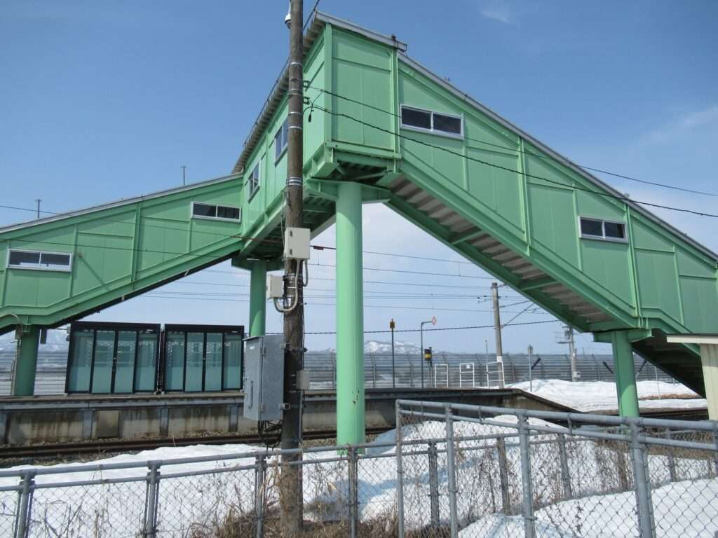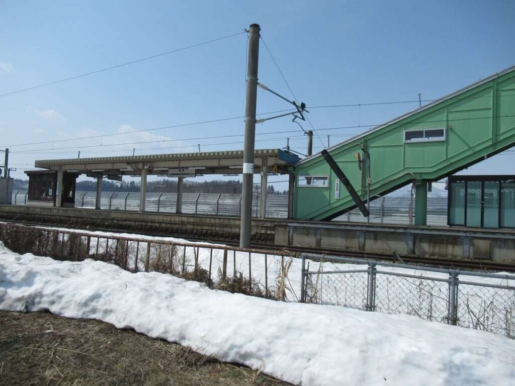 奥羽本線の袖崎駅でございます。「山形線」の愛称区間に含まれております。ミニ新幹線である山形新幹線が走行する単線電化区間にある一線スルー化されている列車交換可能な島式1面2線の地上駅で、簡易な駅舎のある無人駅となっております。駅舎からホームへは上屋付きの跨線橋で連絡しております。