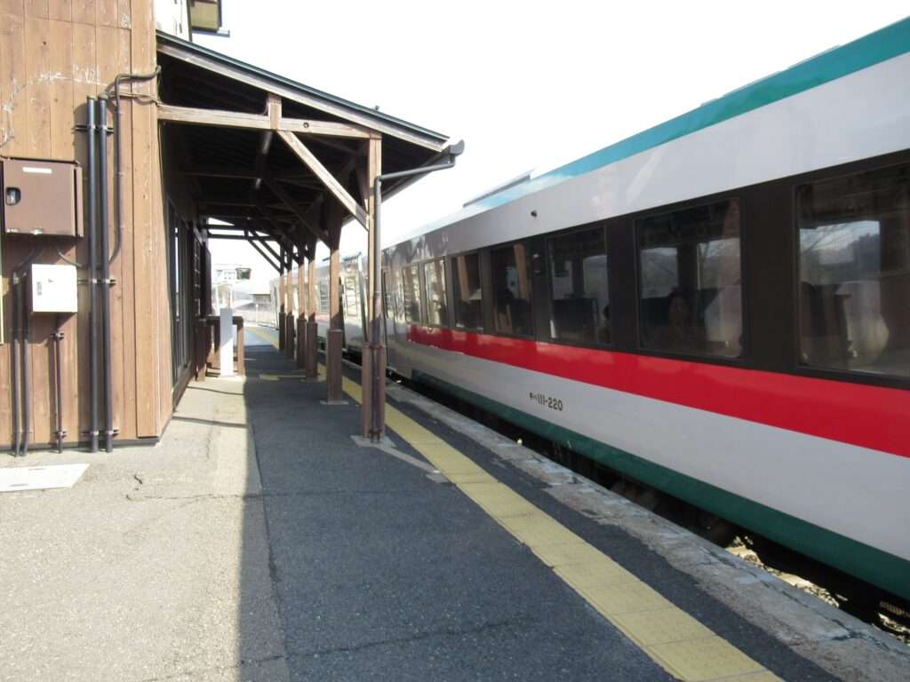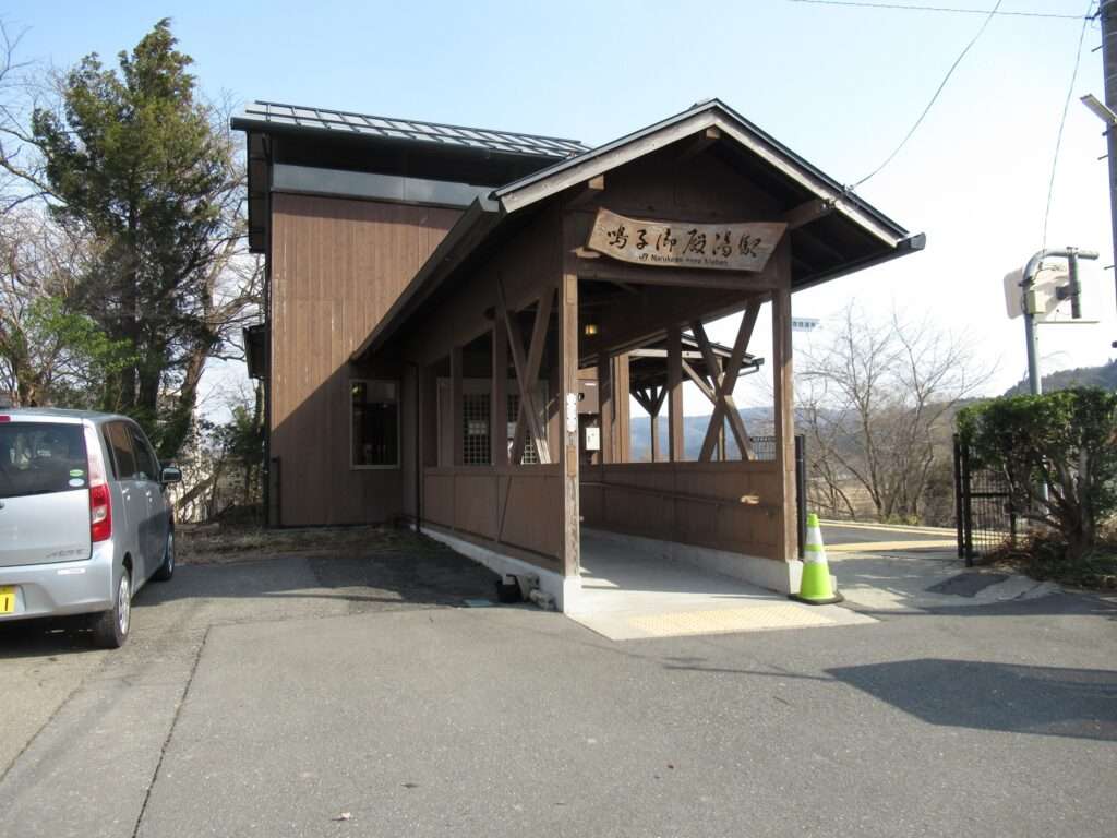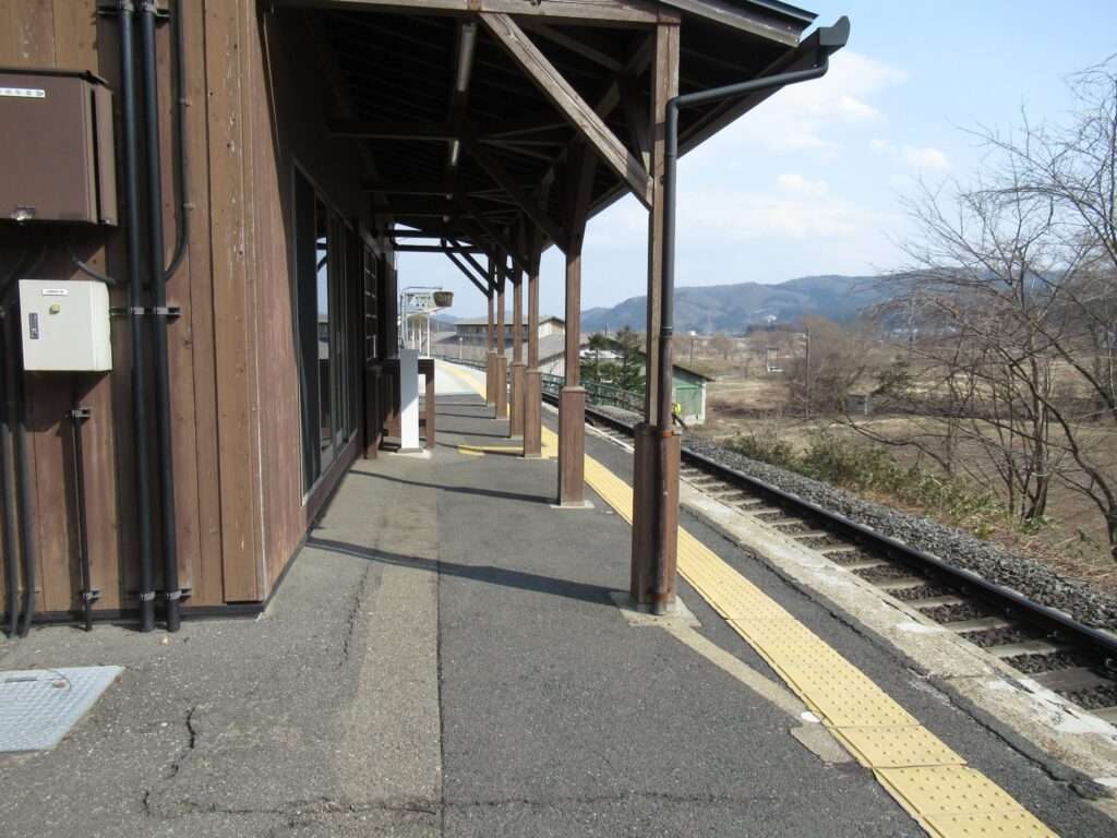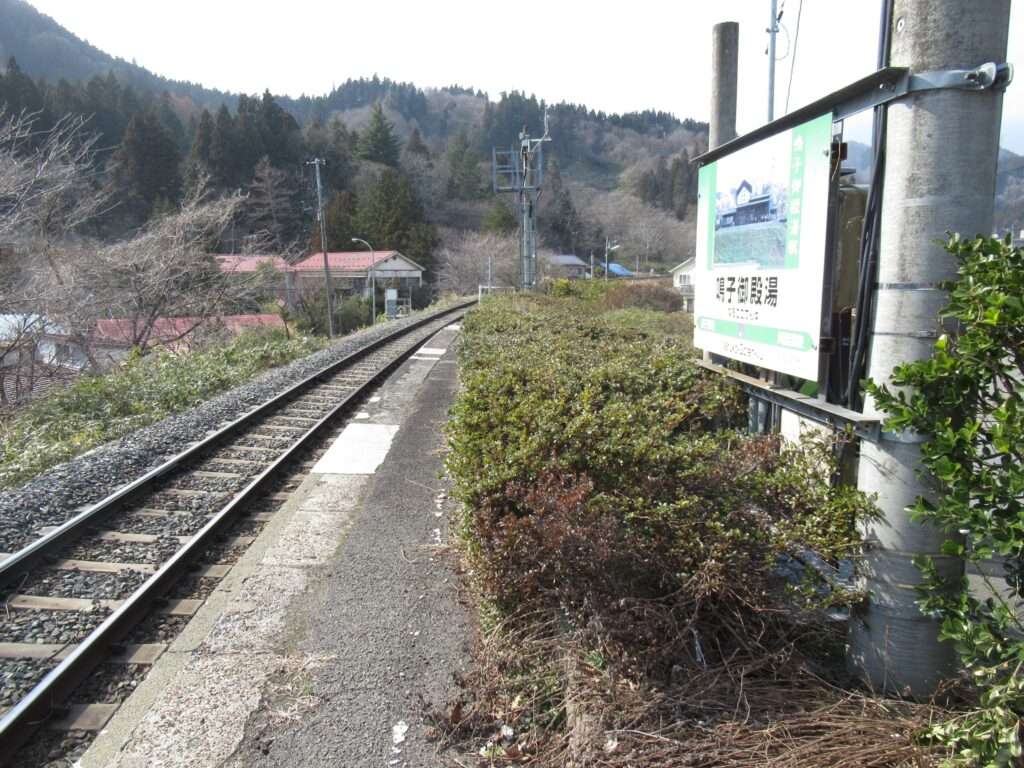 全線非電化単線の路線、奥の細道湯けむりラインこと陸羽東線の鳴子御殿湯駅でございます。盛土上に設置されている地上駅で、単式1面1線の棒線駅となっております。木造駅舎がある簡易委託駅となっております。御殿湯というのは、付近の東鳴子温泉にあった仙台藩藩主専用の風呂のことでございますね。