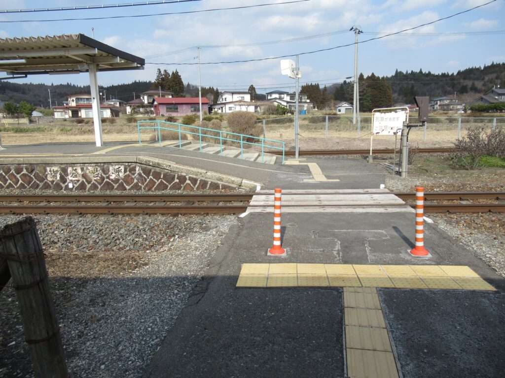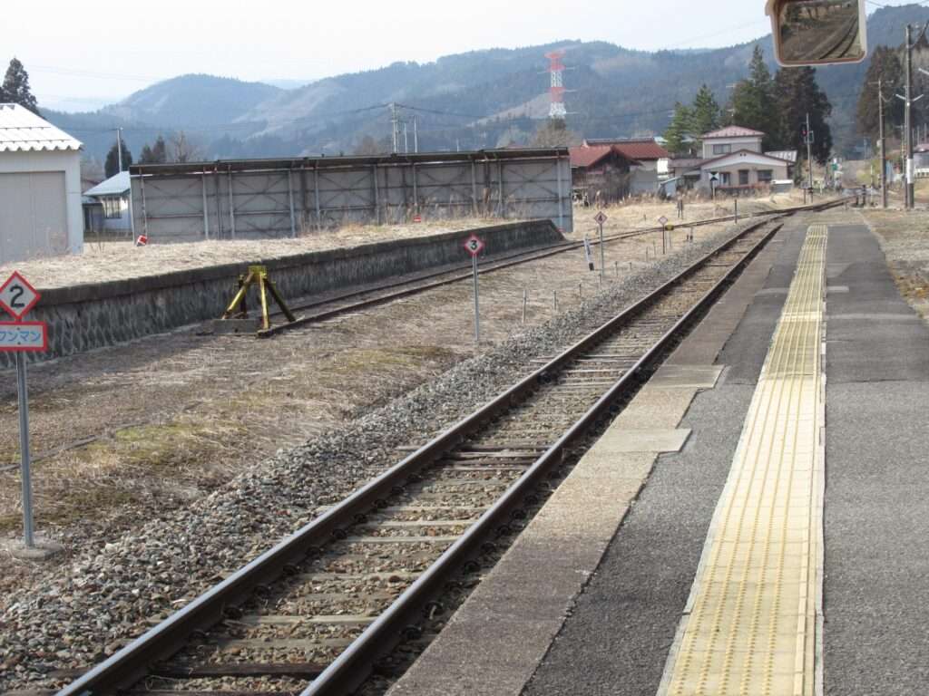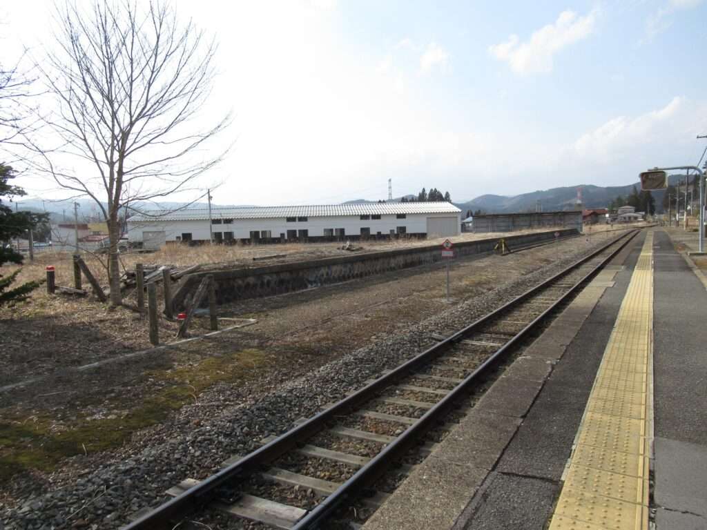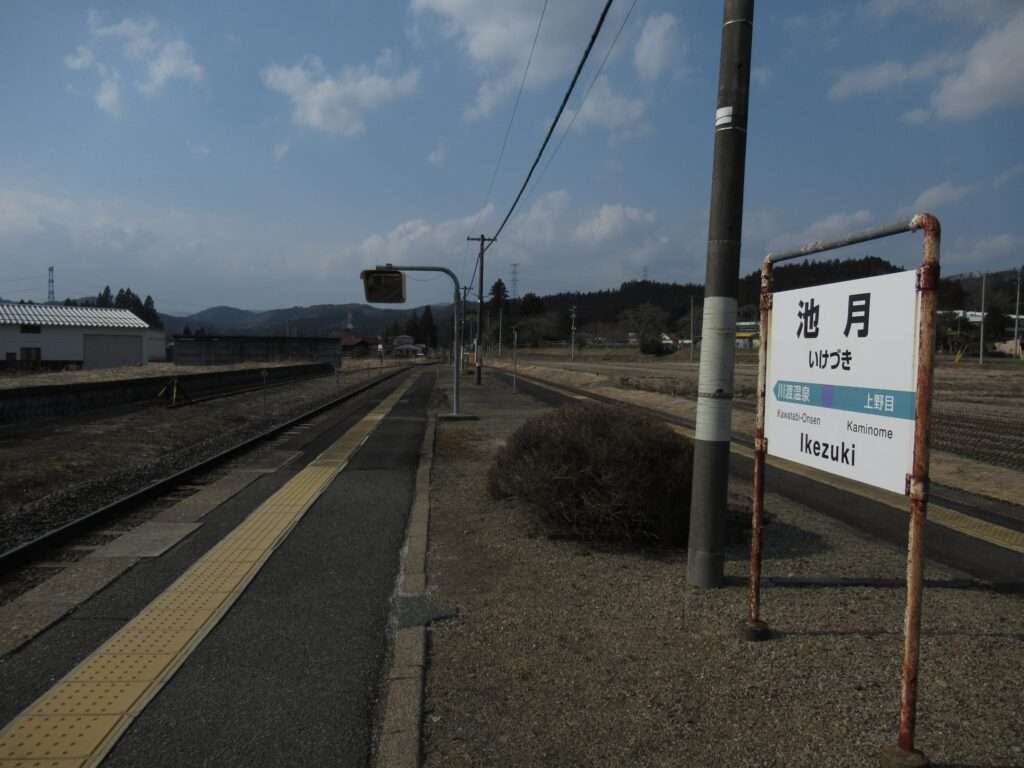 全線非電化単線の路線、奥の細道湯けむりラインこと陸羽東線の池月駅でございます。列車交換可能な島式1面2線の地上駅で、かつての貨物ホームと引込線が残っております。平屋の駅舎がある無人駅で、駅舎とホームは遮断機等のない構内踏切で連絡しております。