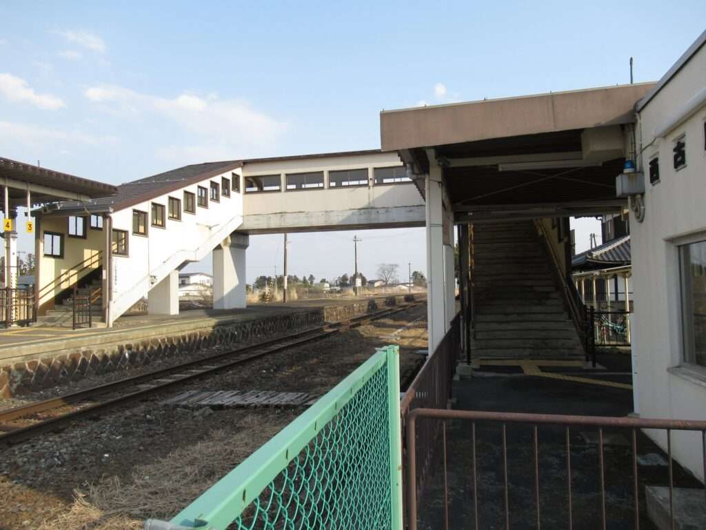全線非電化単線の路線、奥の細道湯けむりラインこと陸羽東線の西古川駅でございます。列車交換可能な島式1面2線の地上駅で、平屋の駅舎がある簡易委託駅となっております。ホームには和風デザインの待合室がございます。駅舎からホームへは、上屋付きの跨線橋で連絡しております。