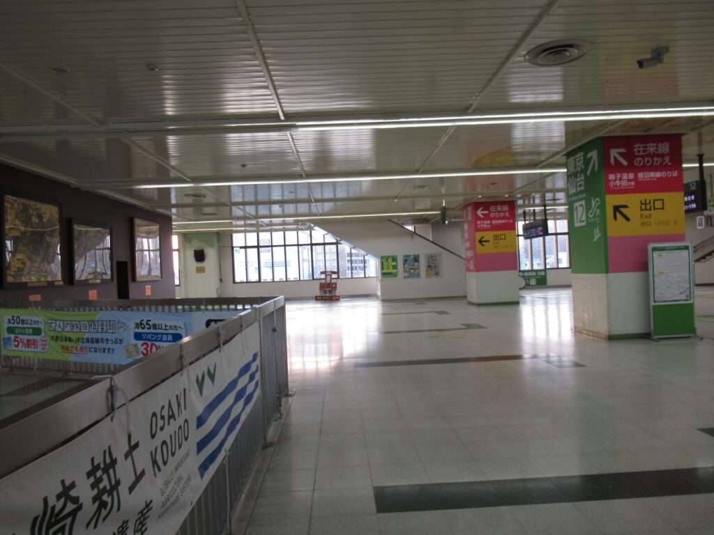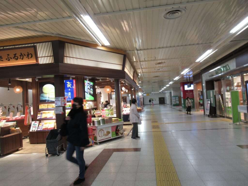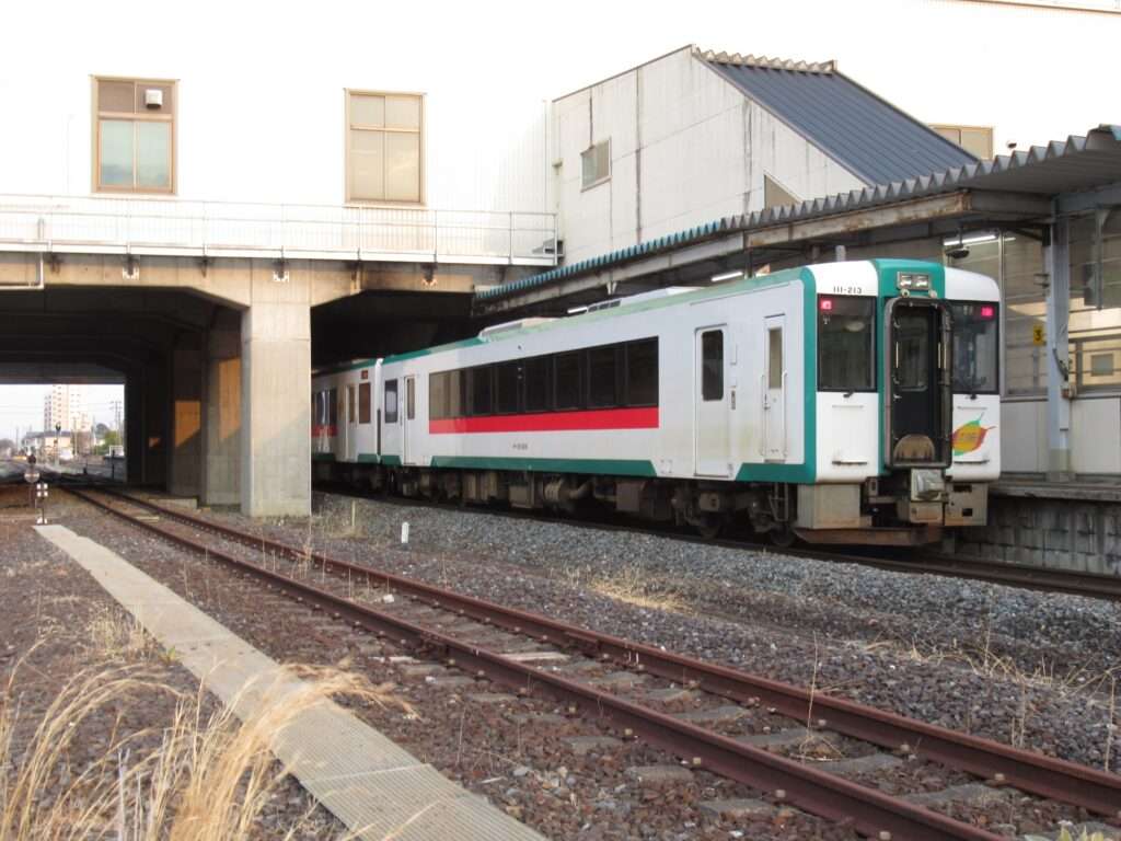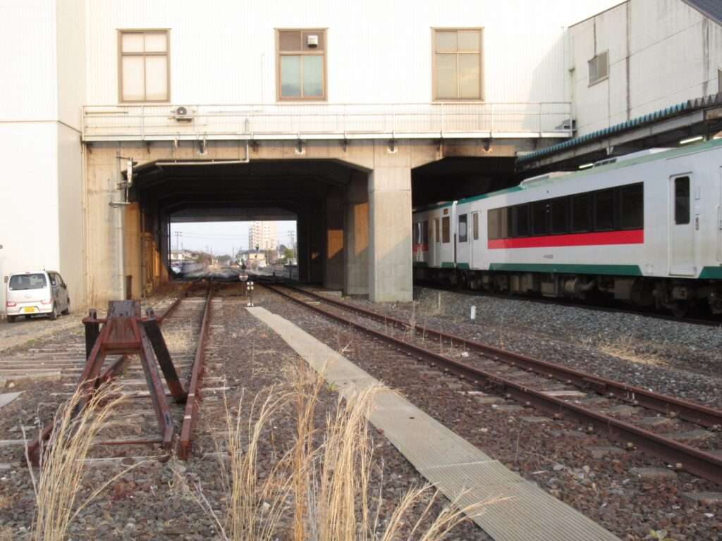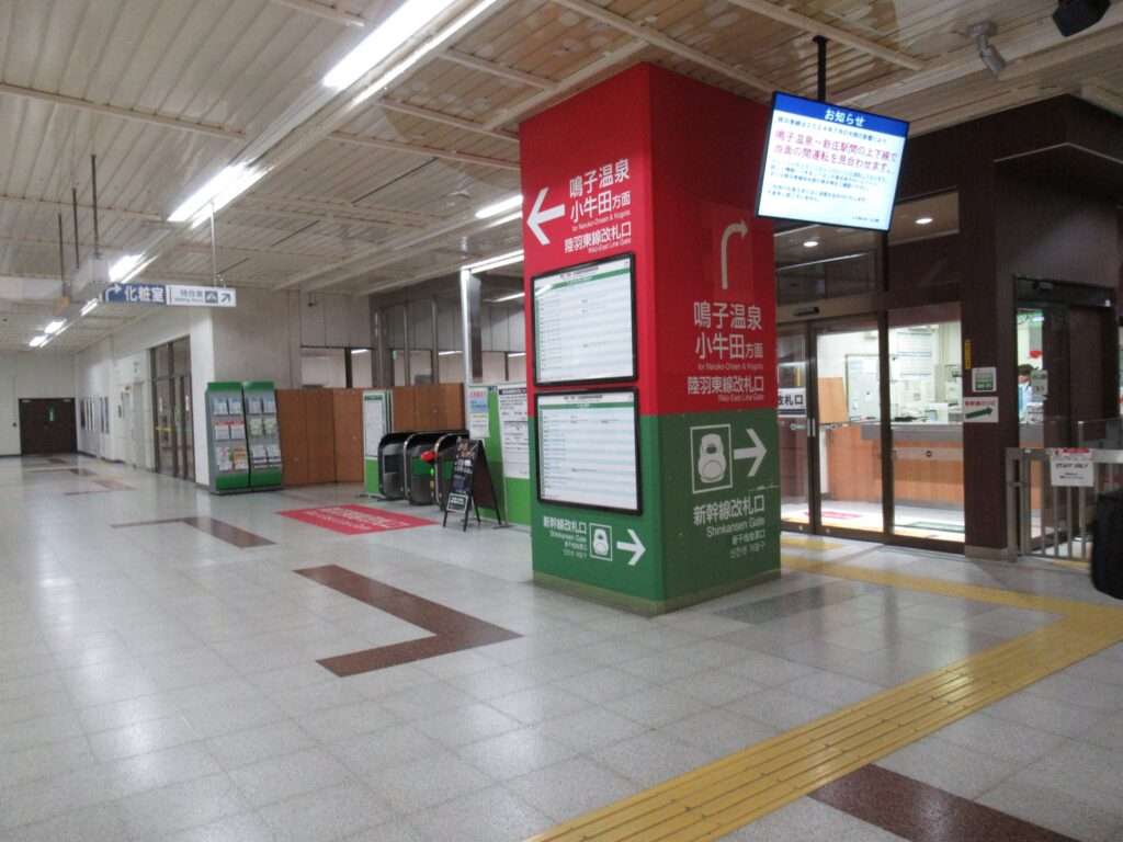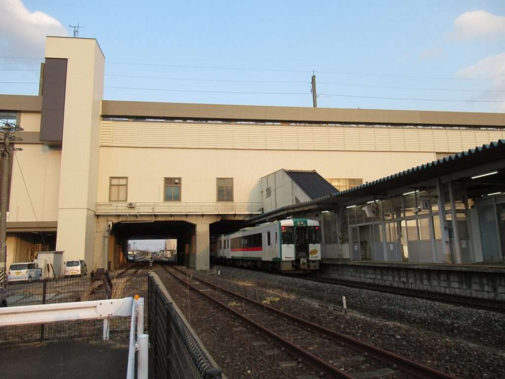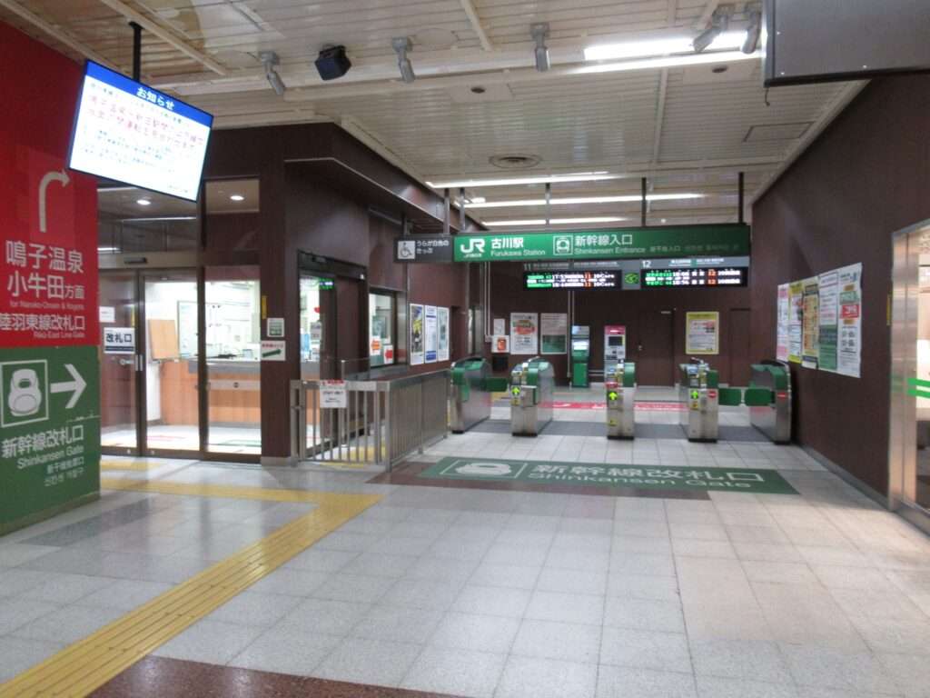 東北新幹線と陸羽東線の古川駅でございます。両線は直角に交差しております。東北新幹線は3階にホームがある高架駅で、相対式2面2線の間に通過線1線がある構造となっております。全線非電化単線の路線、奥の細道湯けむりラインこと陸羽東線の駅は列車交換可能な島式1面2線の地上駅で、2階に改札がある橋上駅でございます。両線の連絡改札は無く、乗換えは一度改札外に出る必要がございます。古川学園中学校・高等学校などの最寄り駅となっております。