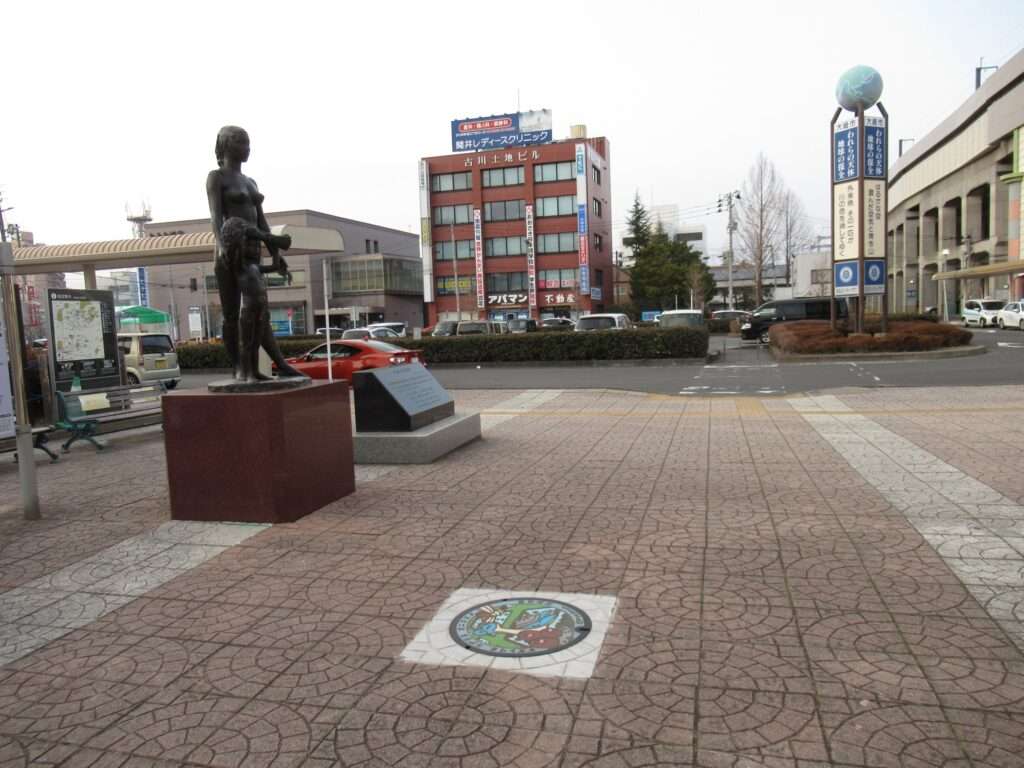 古川駅前にあったポケットモンスターシリーズのデザインマンホール蓋、いわゆるポケフタでございます。ダグトリオ、ラプラス、オニスズメが描かれております。