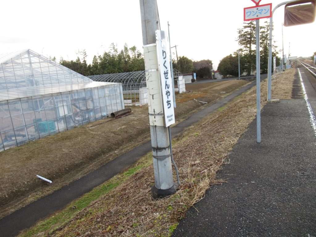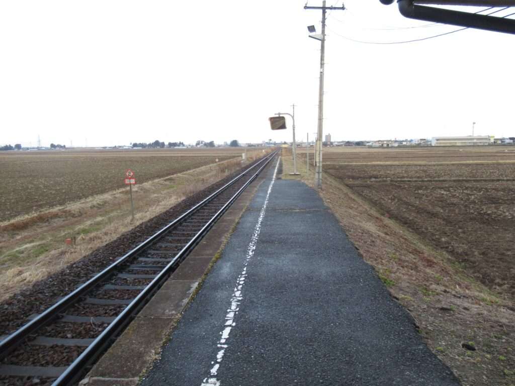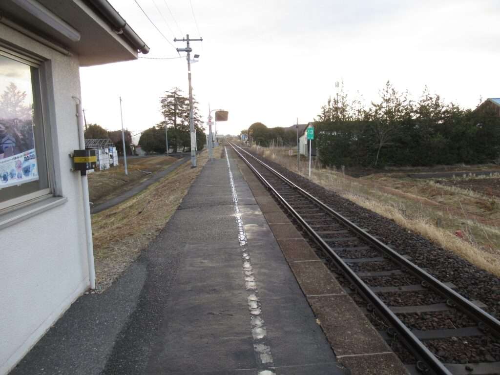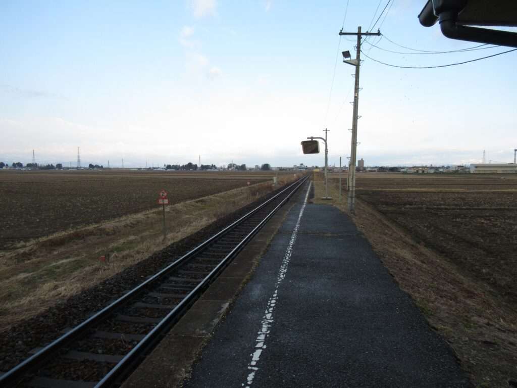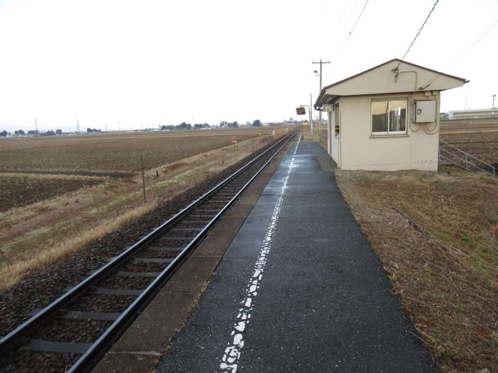 全線非電化単線の路線、奥の細道湯けむりラインこと陸羽東線の陸前谷地駅でございます。田園地帯の中の地上駅で、単式1面1線の棒線駅となっております。ホームに接して簡易な駅舎のある無人駅でございます。