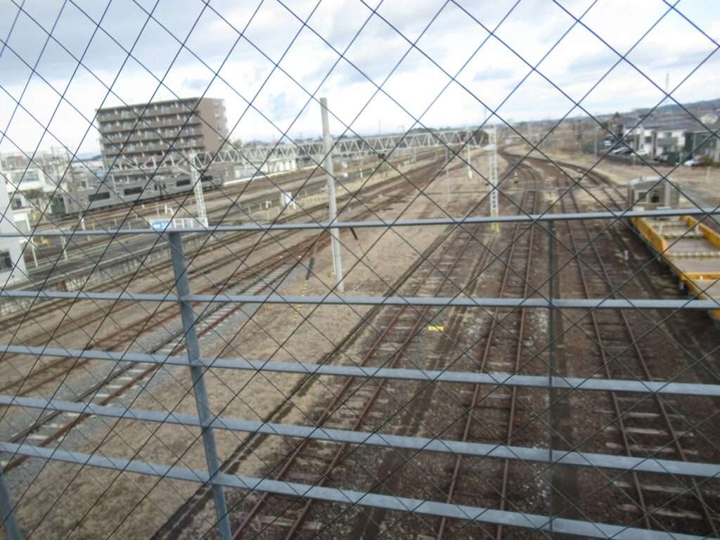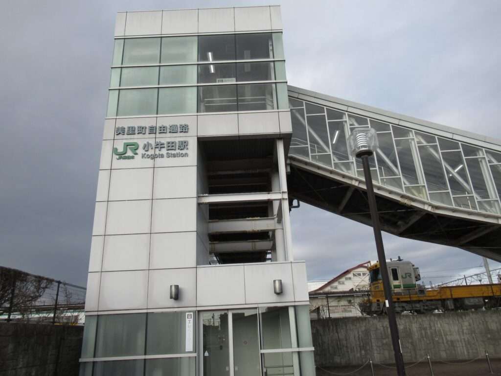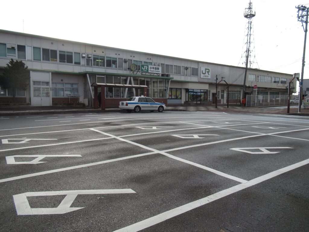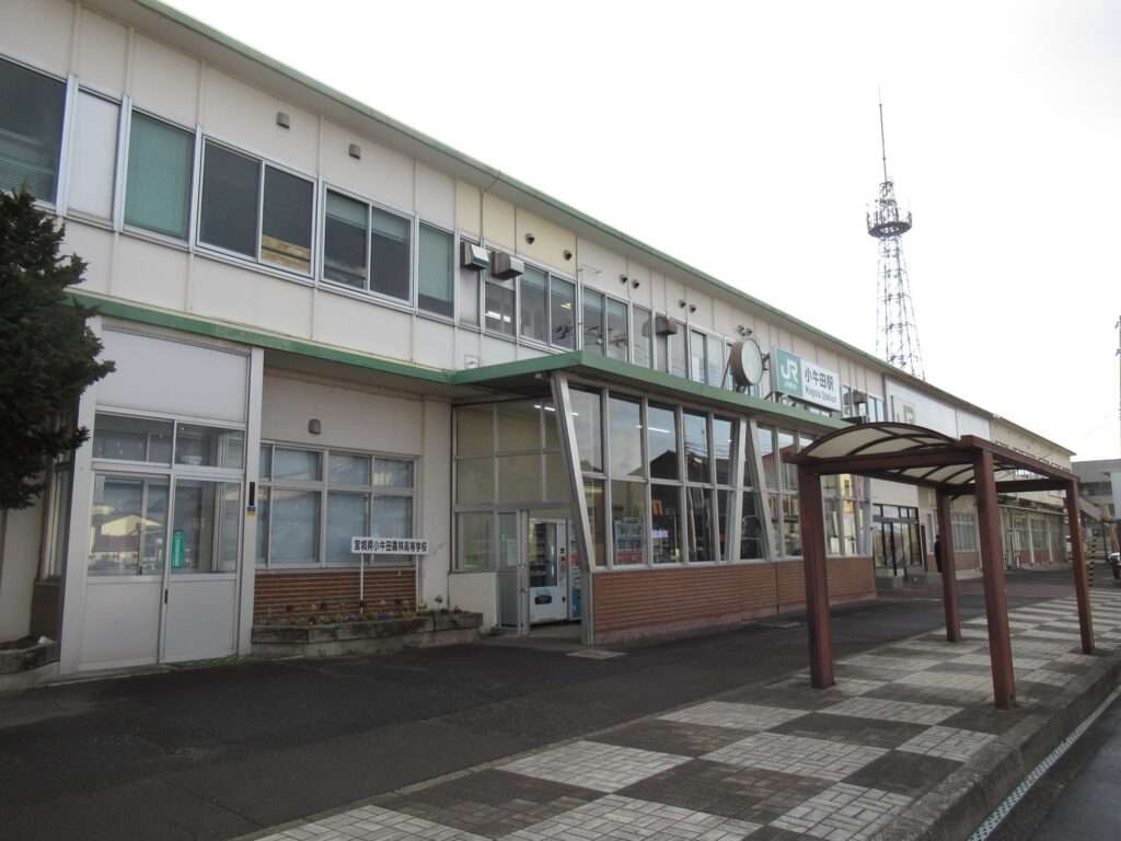 東北本線・陸羽東線・石巻線の3路線が乗り入れている小牛田駅でございます。島式2面4線の地上駅で、仙台車両センター小牛田派出所が隣接、車庫や留置線が数多くございます。2階建ての駅舎からホームへ連絡する上屋付き跨線橋の中に改札があるのと、別に自由通路の跨線橋がございます。気仙沼線の一部列車も乗り入れております。