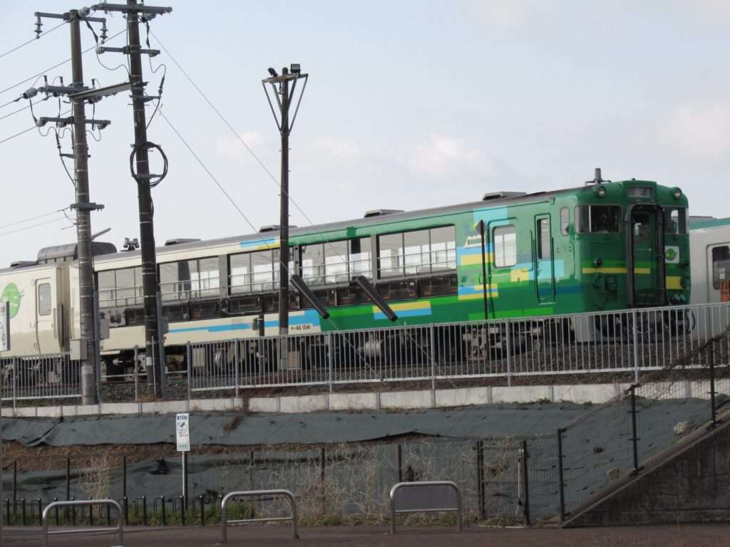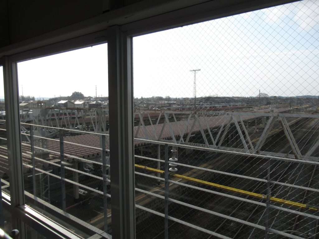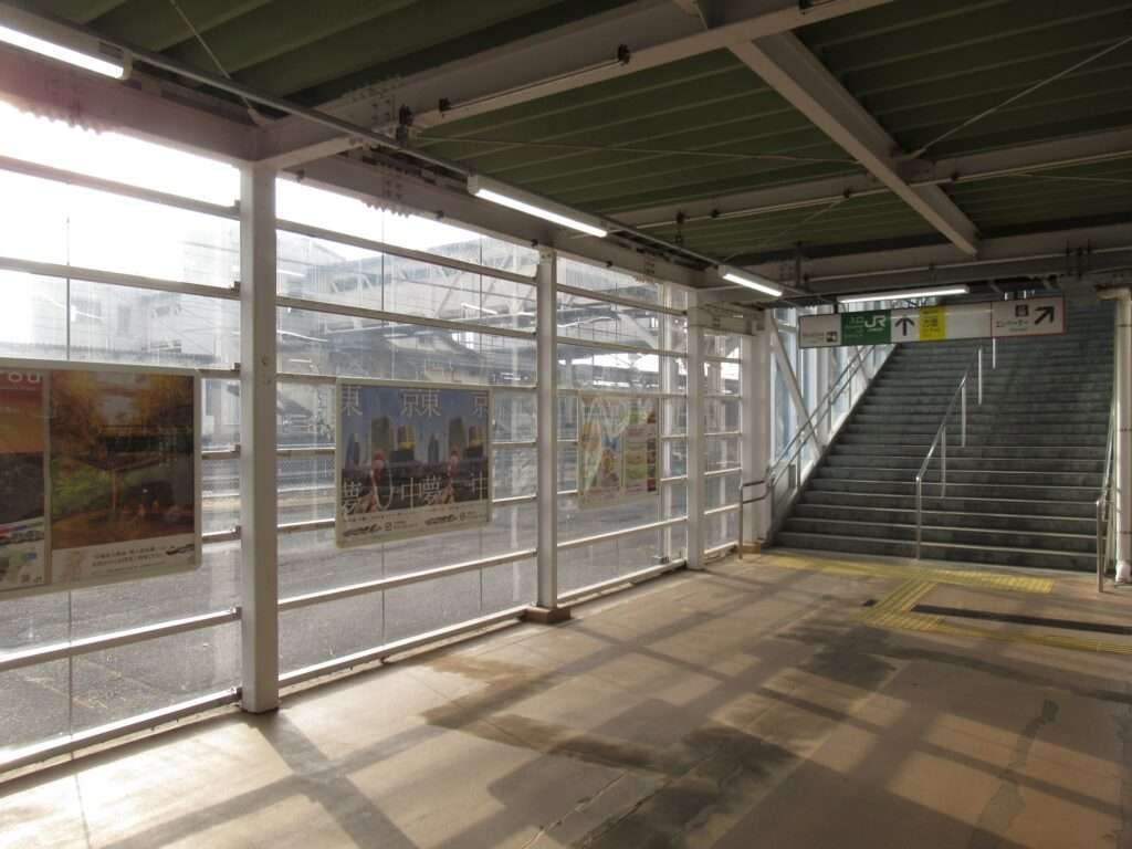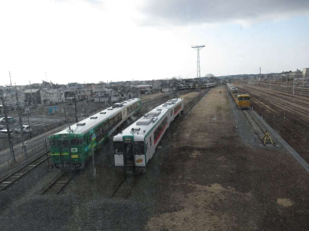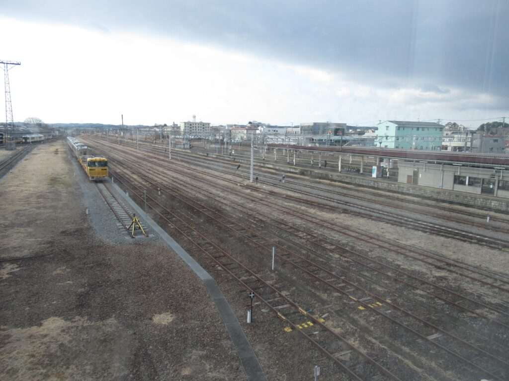 東北本線・陸羽東線・石巻線の3路線が乗り入れている小牛田駅でございます。島式2面4線の地上駅で、仙台車両センター小牛田派出所が隣接、車庫や留置線が数多くございます。2階建ての駅舎からホームへ連絡する上屋付き跨線橋の中に改札があるのと、別に自由通路の跨線橋がございます。気仙沼線の一部列車も乗り入れております。