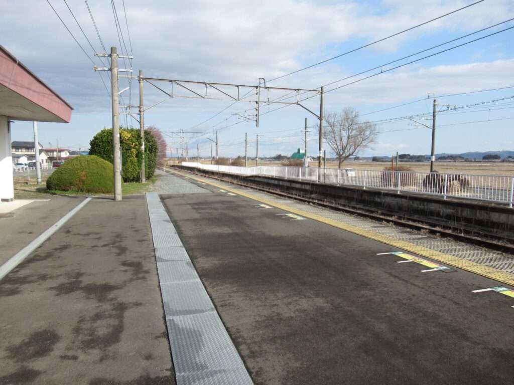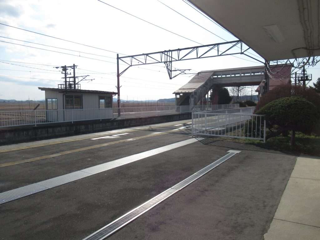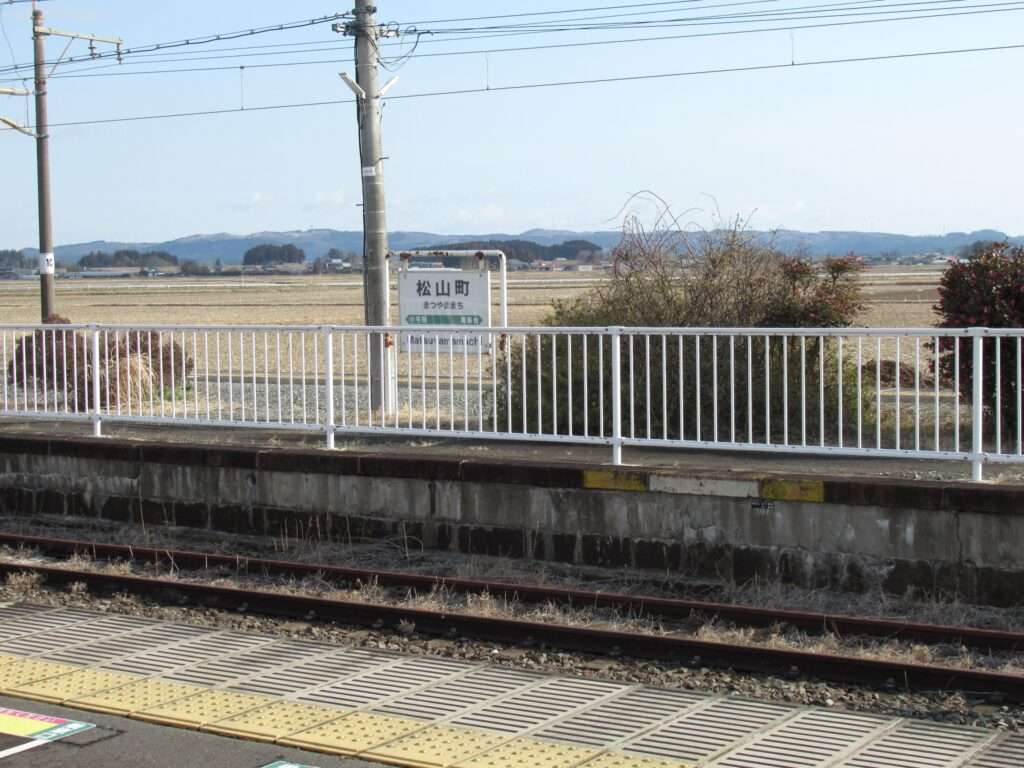 東北本線の松山町駅でございます。複線電化区間にある単式島式複合型の2面3線、いわゆる国鉄型配線だったうちの中線を廃止、横取り線とした単式2面2線の地上駅で、平屋の駅舎がある業務委託駅となっております。ホーム間は上屋付きの跨線橋で連絡しております。