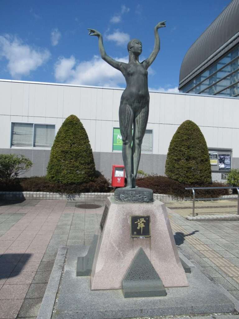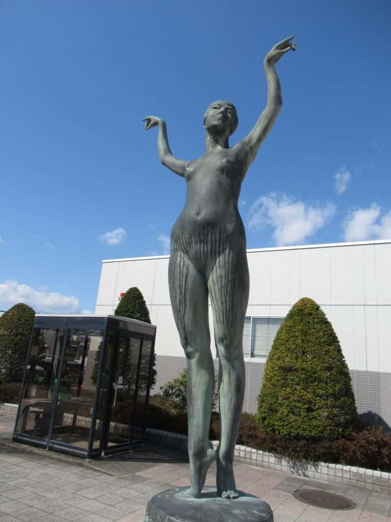 槻木駅前広場に設置されている女性裸像「舞」でございます。柴田町出身の彫刻家、小室達さんの作品でございます。この方は仙台城にある伊達政宗騎馬像を制作した方なのだそうでございます。