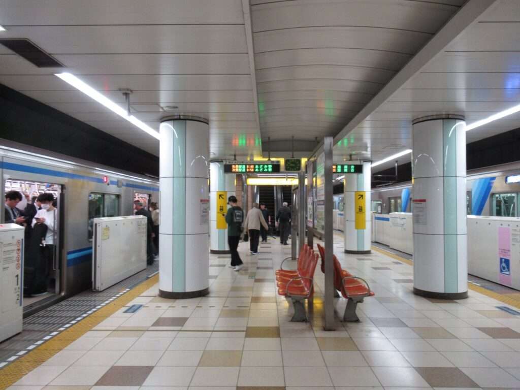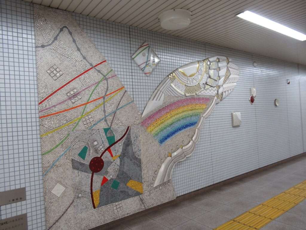 横浜市営地下鉄ブルーラインの中田駅でございます。正式には横浜市営地下鉄1号線の駅ですが、横浜市営地下鉄1号線と3号線は一体の路線ブルーラインとして運行されております。島式1面2線の地下駅となっております。コンコースにパブリックアート「虹の翼」がございます。こちらは工藤晴也さんという方の作品でございます。
