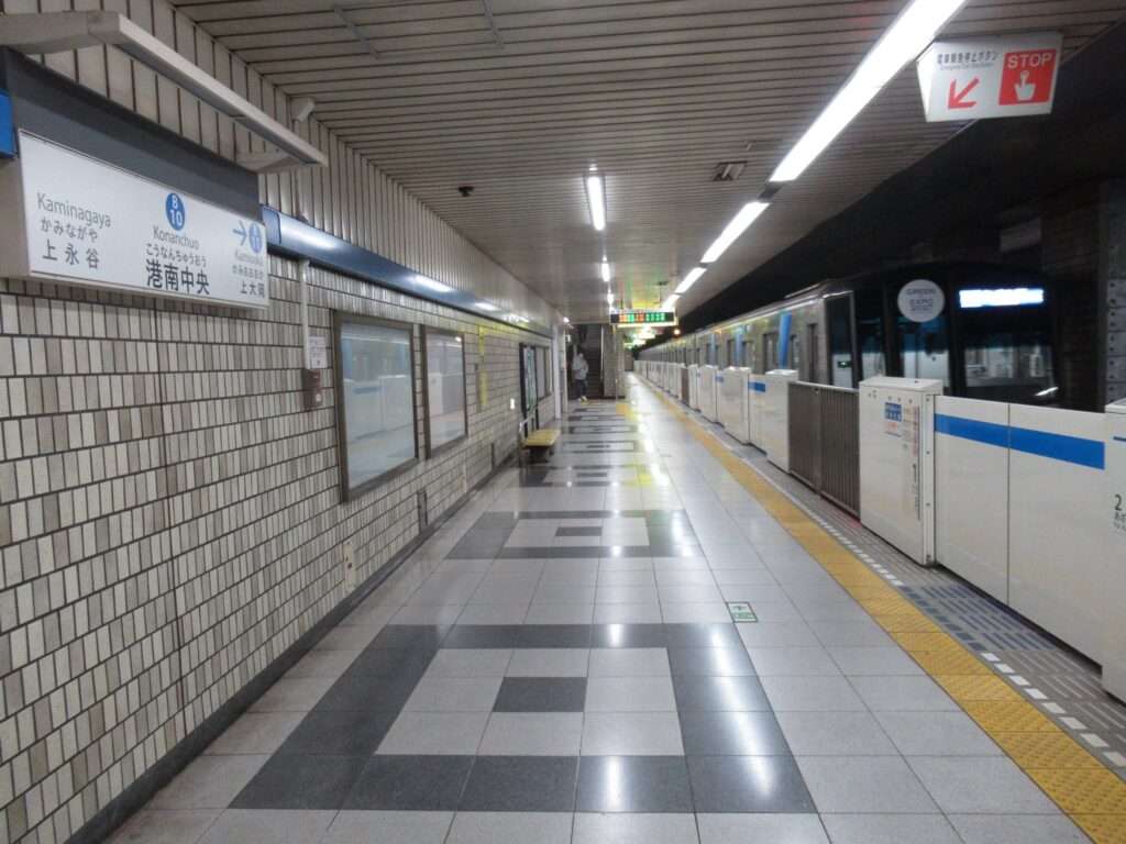 横浜市営地下鉄ブルーラインの港南中央駅でございます。正式には横浜市営地下鉄1号線の駅ですが、横浜市営地下鉄1号線と3号線は一体の路線ブルーラインとして運行されております。相対式2面2線の地下駅となっております。駅周辺には、港南区役所などの公共施設が集積しております。
