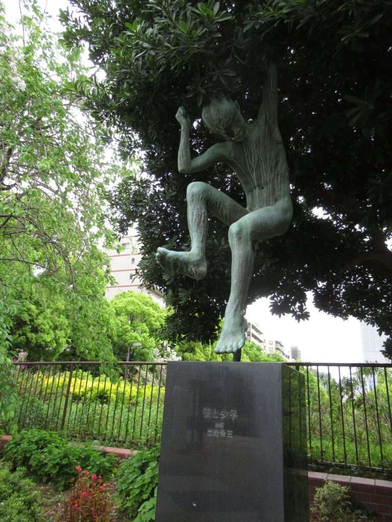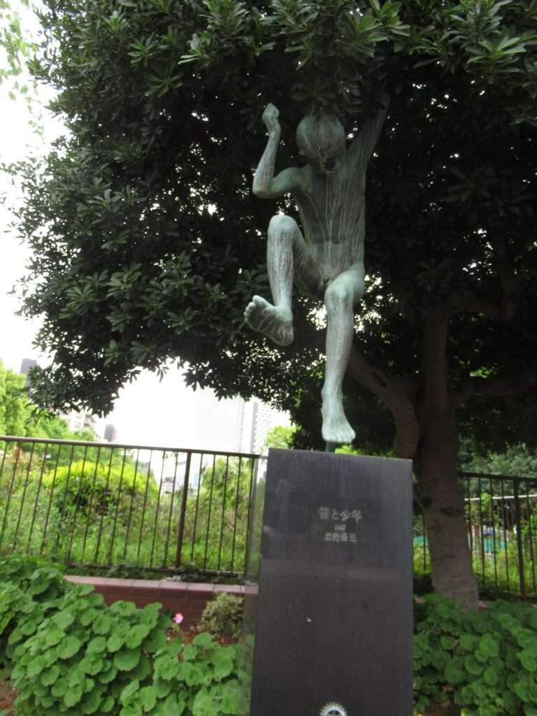 横浜市営地下鉄ブルーラインの阪東橋駅から伊勢佐木長者町駅を経由してJR関内駅付近まで続く運河を埋め立てて整備された帯状の公園、大通り公園にある「笹と少年」です。岩野勇三さんの作品で、少年が片手で笹を持ち飛び上がっている姿の像でございます。