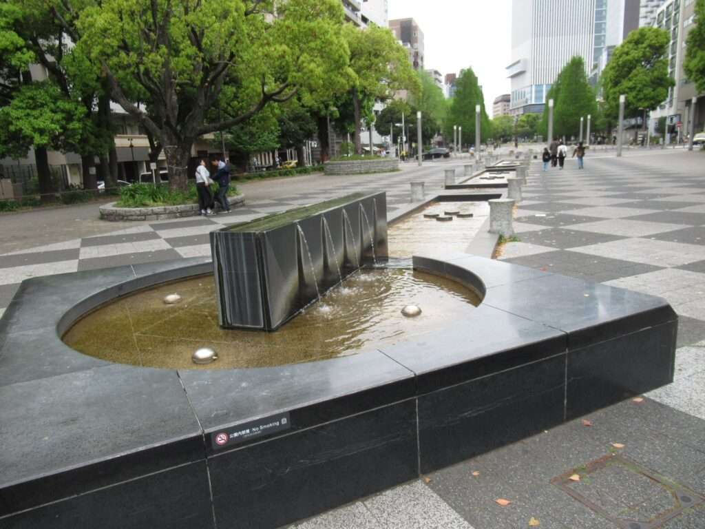 横浜市営地下鉄ブルーラインの阪東橋駅から伊勢佐木長者町駅を経由してJR関内駅付近まで続く運河を埋め立てて整備された帯状の公園、大通り公園にある水の広場でございます。