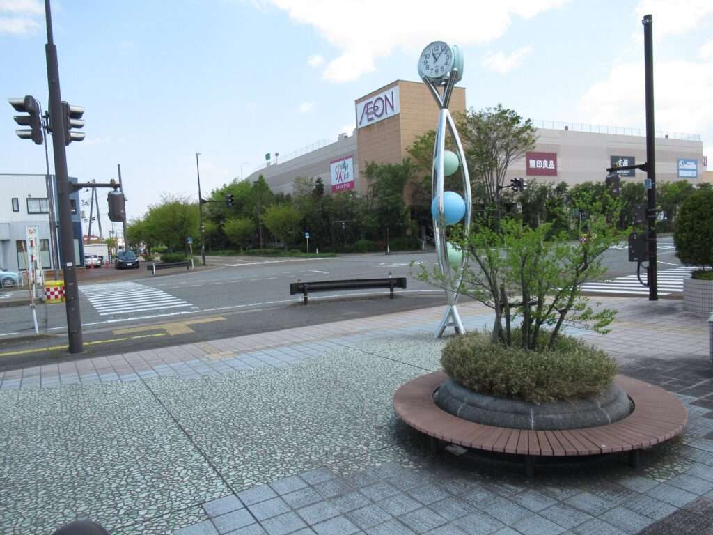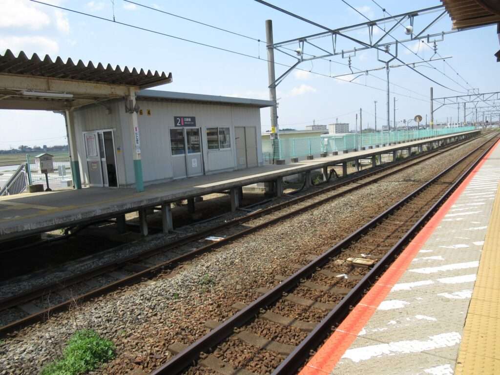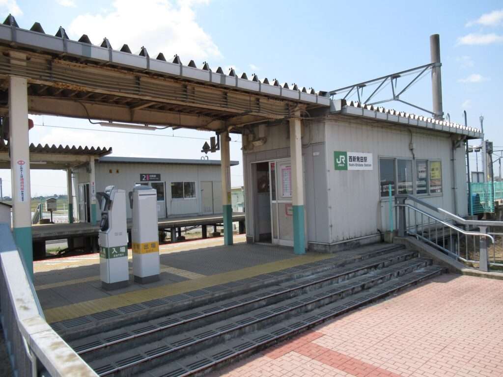 白新線の西新発田駅でございます。単線電化区間にある列車交換可能な相対式2面2線の地上駅で、両ホームに簡易な駅舎がある無人駅となっております。ホーム間は上屋付きの跨線橋で連絡しております。北口の目の前にイオンモール新発田がございます。