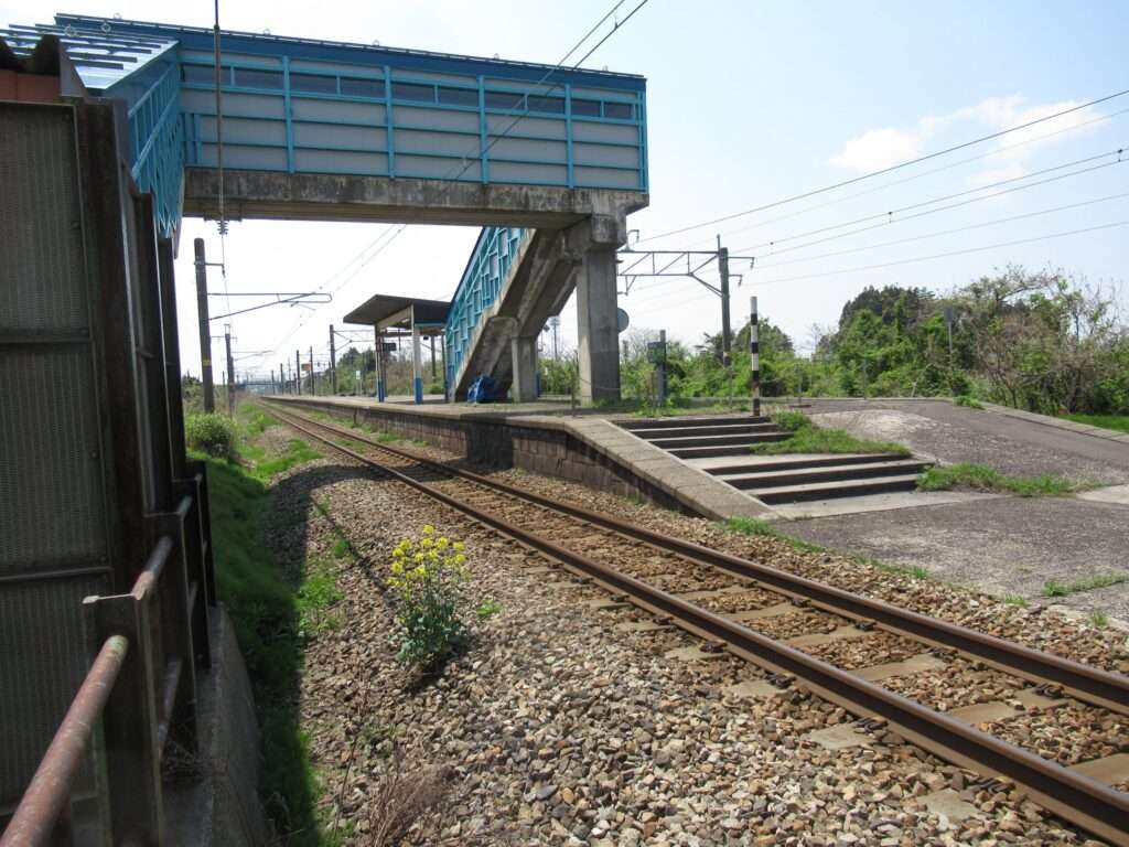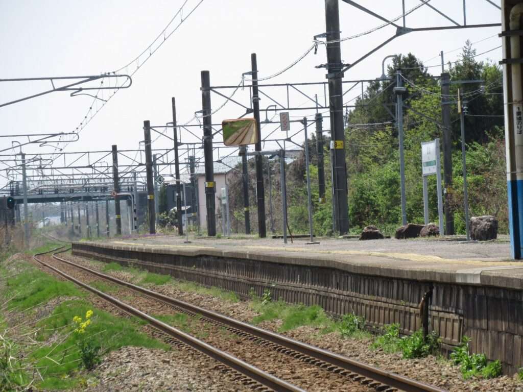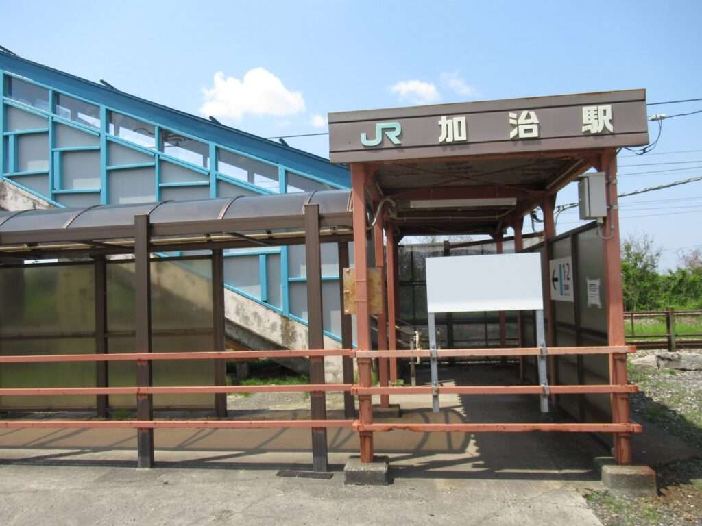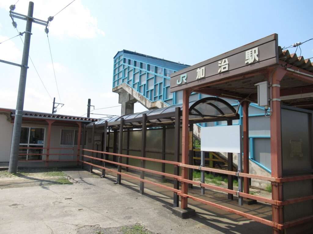 羽越本線の加治駅でございます。複線電化区間にある島式1面2線の地上駅で、平屋の駅舎がある無人駅となっております。駅舎からホームへは上屋付きの跨線橋で連絡しております。ホームにはかつて構内踏切で連絡していた頃の名残で、跨線橋側の端部に階段とスロープが残っております。