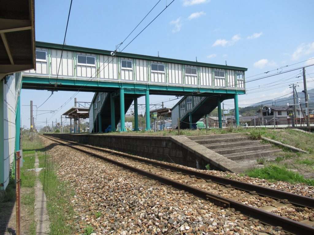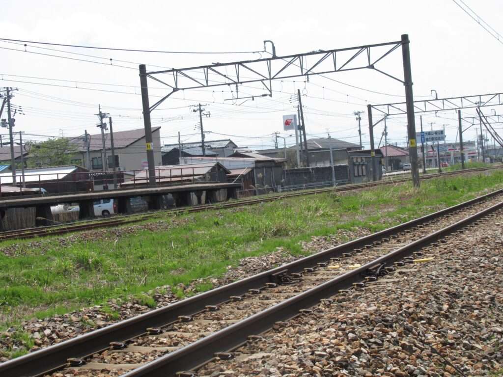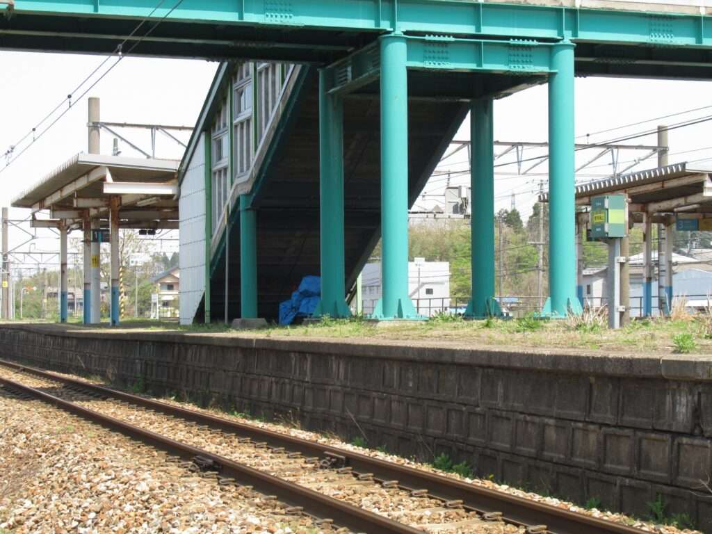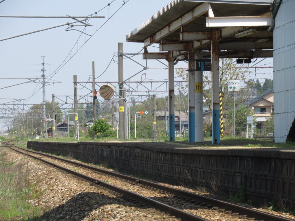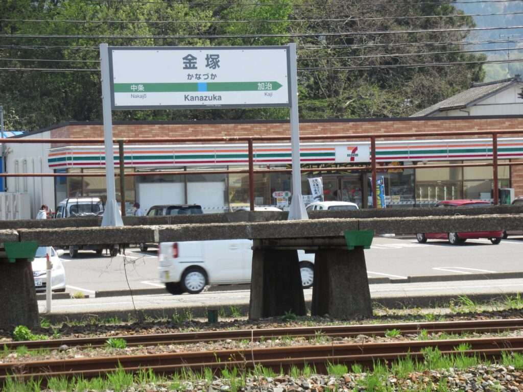 羽越本線の金塚駅でございます。隣駅の中条駅まで単線電化、新発田駅方面が複線電化の区間にある単式島式複合型の2面3線、いわゆる国鉄型配線の地上駅で、西口側に平屋の駅舎がある無人駅となっております。ホーム間は上屋付きの跨線橋で連絡しております。国道7号に面した東口にも簡易な出入口が設けられております。