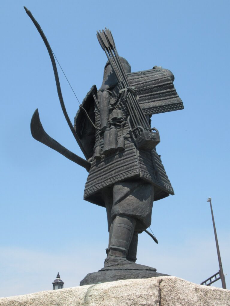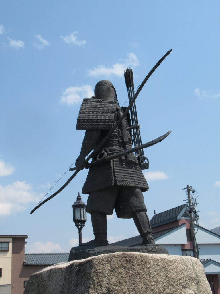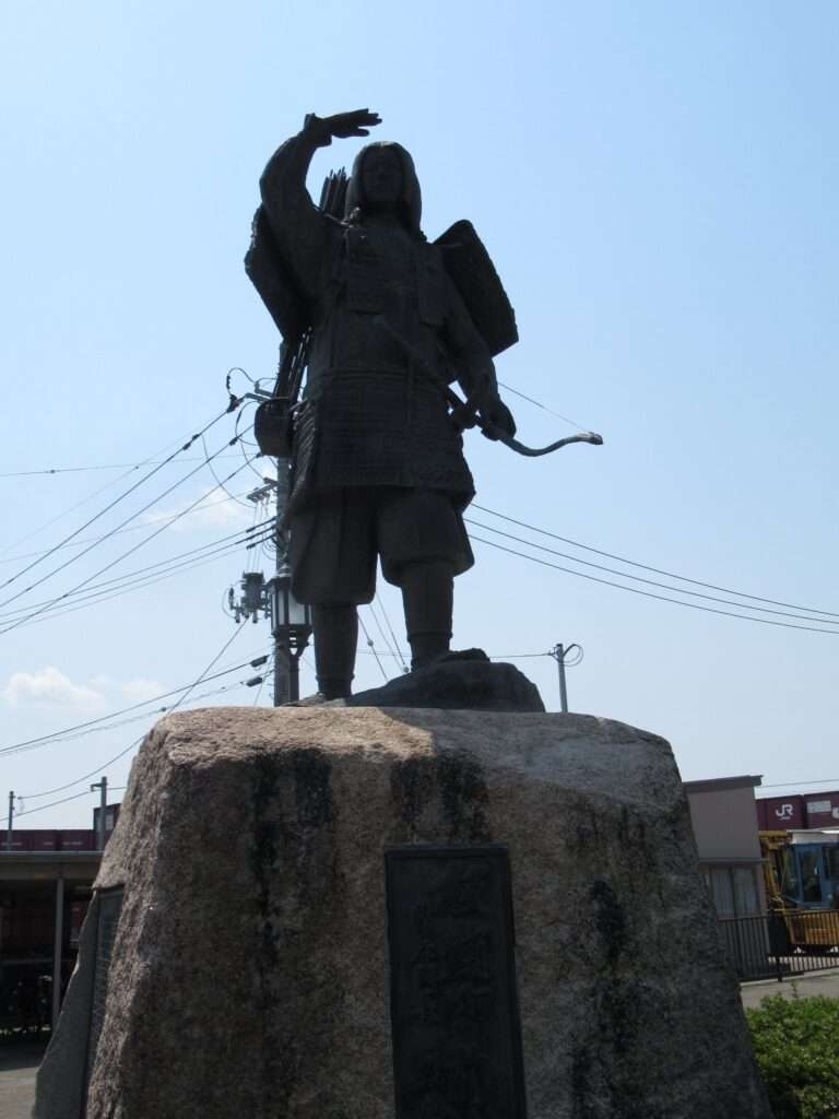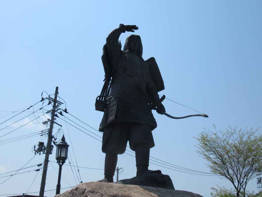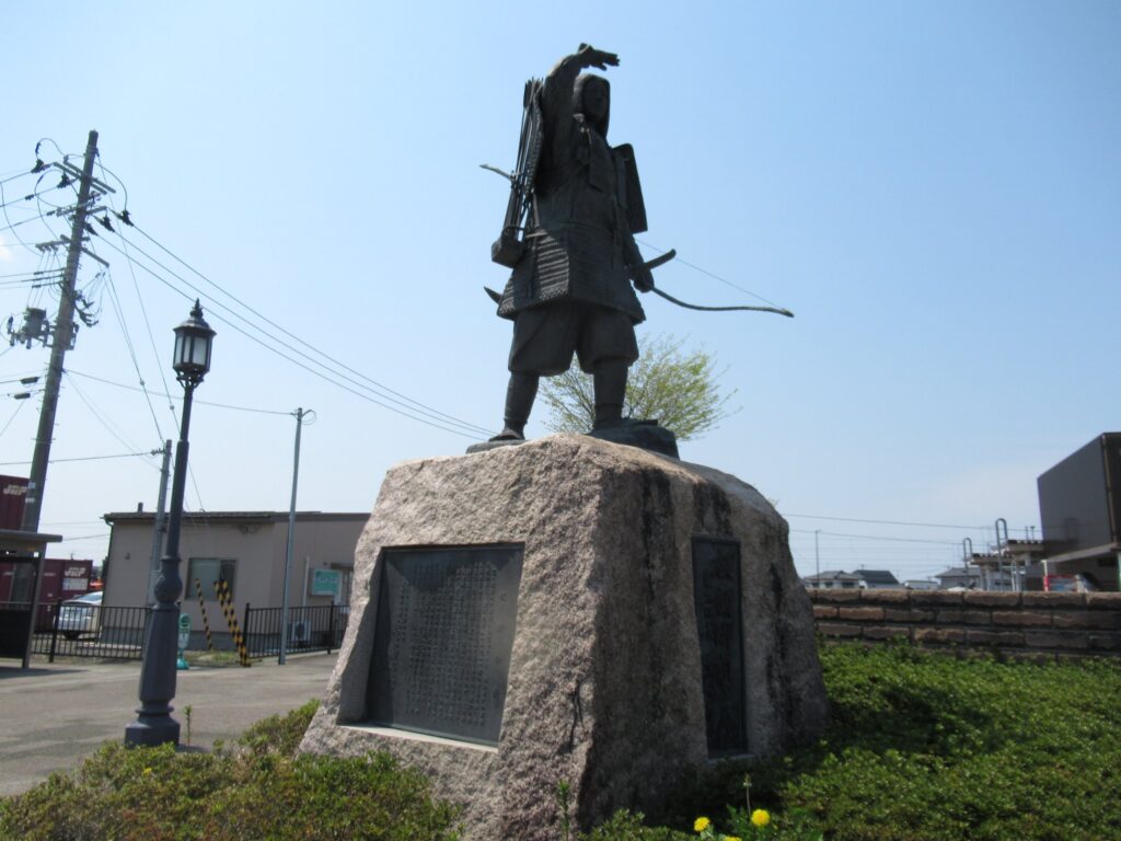 羽越本線の中条駅前に建つ、板額御前の像でございます。鎌倉時代の女傑で、弓矢の名手だったと伝えられておりますですな。浄瑠璃や歌舞伎に登場する人物でごさいます。古来、女傑の代名詞として用いられる「巴板額」は巴御前と板額御前のことなんだそうですわ、知らんけど(←知らんのかいw)。