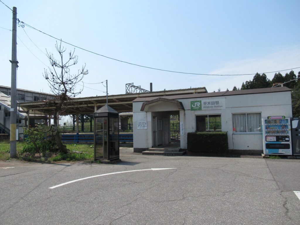 羽越本線の平木田駅でございます。複線電化区間にある地上駅で、かつては単式島式複合型の2面3線、いわゆる国鉄型配線だったうちの1線を廃止した単式2面2線の駅となっております。他に中線もあり同様に廃止されておりますが、レールは完全に撤去されておらず、痕跡が残っております。平屋の駅舎がある無人駅で、各ホームへは上屋付きの跨線橋で連絡しております。