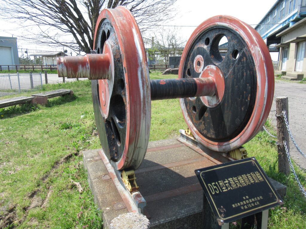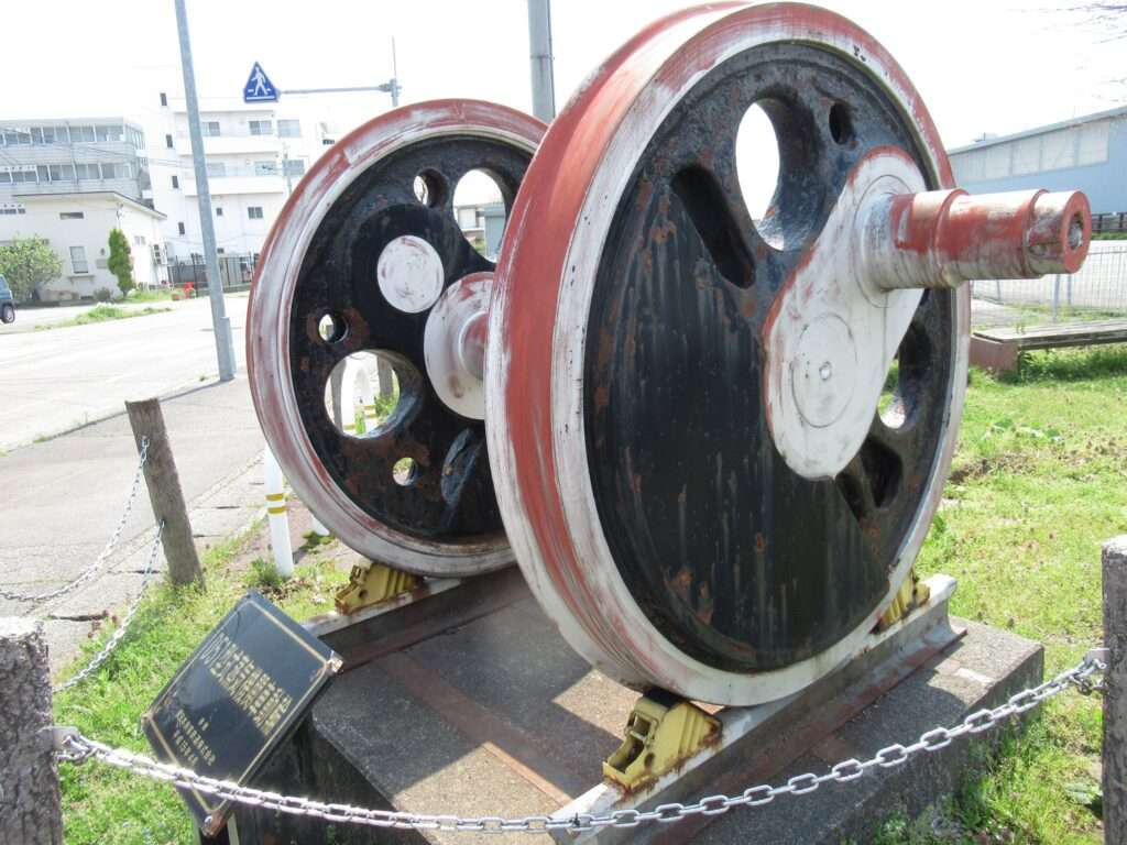 坂町駅前広場に展示されているD51形の動輪でございます。坂町駅にはかつて構内に坂町機関区があったのでございます。現在も構内に転車台が残っております。転車台は蒸気機関車けん引の「SL村上ひな街道号」の運転の際に使用されているそうでございます。