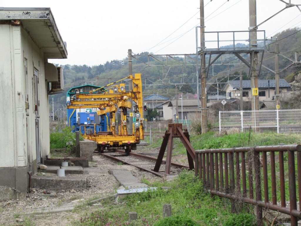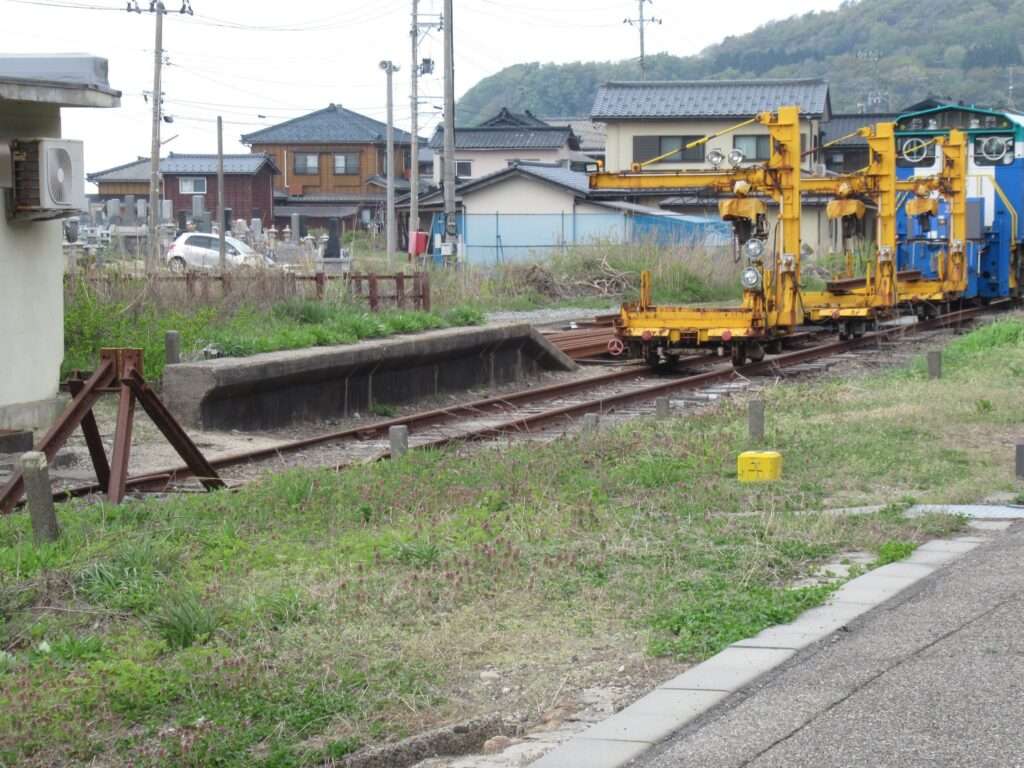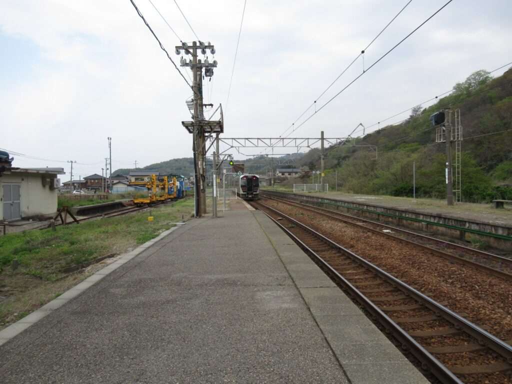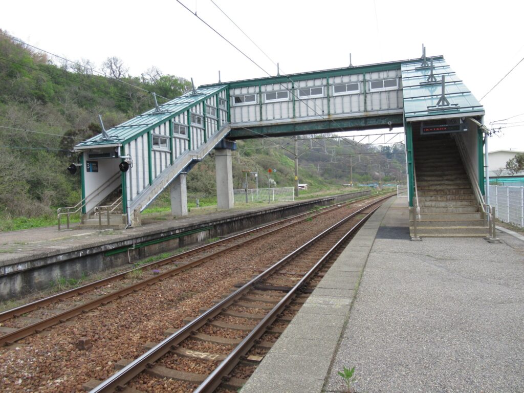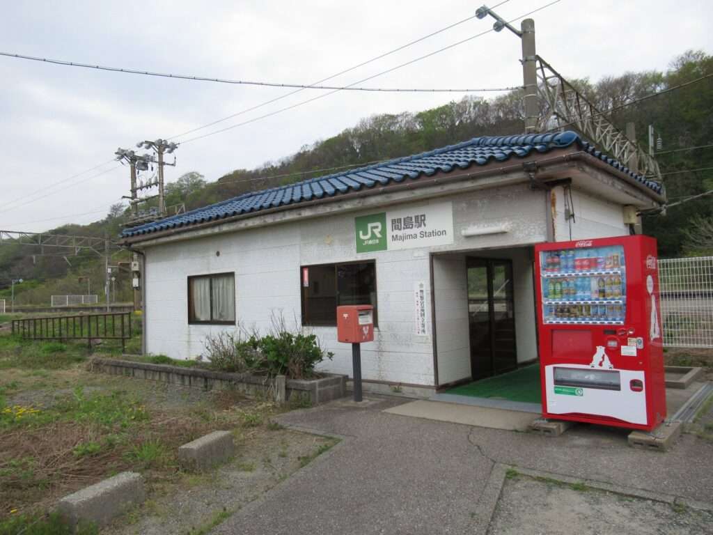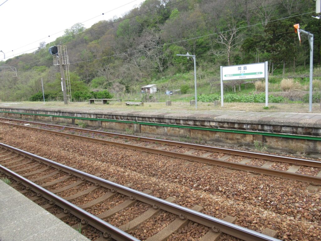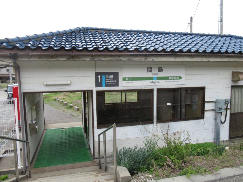羽越本線の間島駅でございます。村上駅まで複線電化、越後早川駅間は単線電化となる区間にある単式島式複合型の2面3線、いわゆる国鉄型配線の地上駅で、工事車両の留置線がございます。平屋の駅舎がある無人駅で、各ホームへは上屋付きの跨線橋で連絡しております。ここと村上駅までの間に交直デッドセクションがございます。至って長閑な雰囲気の駅でございます。