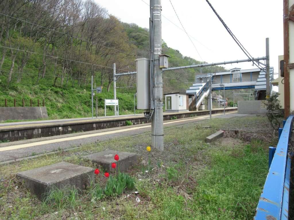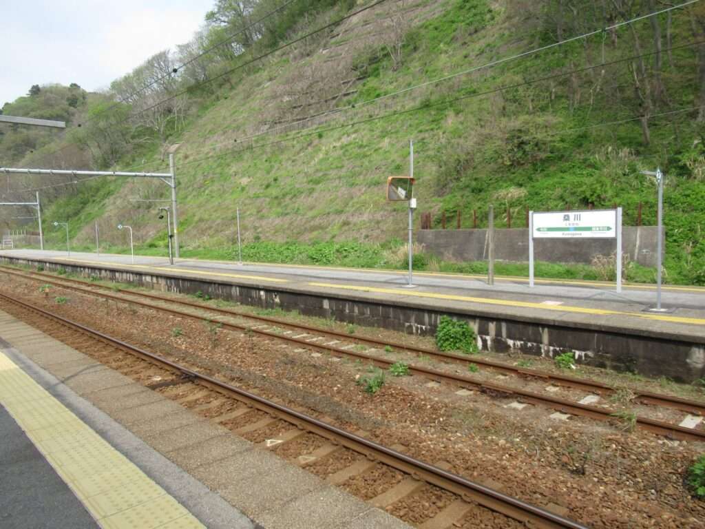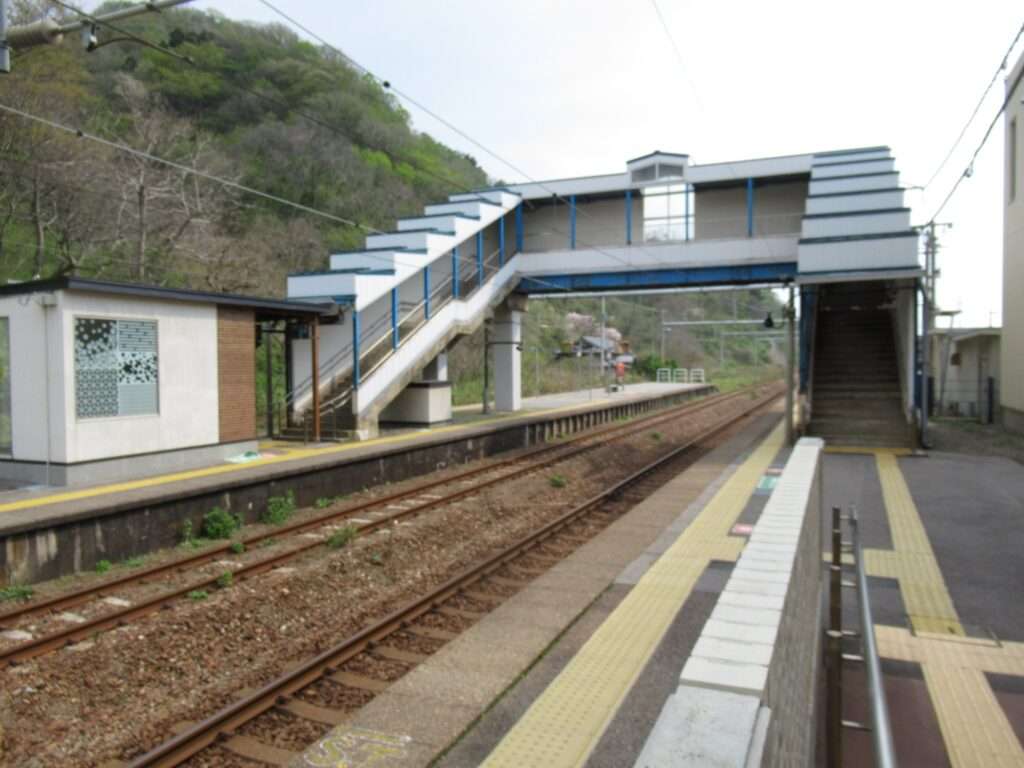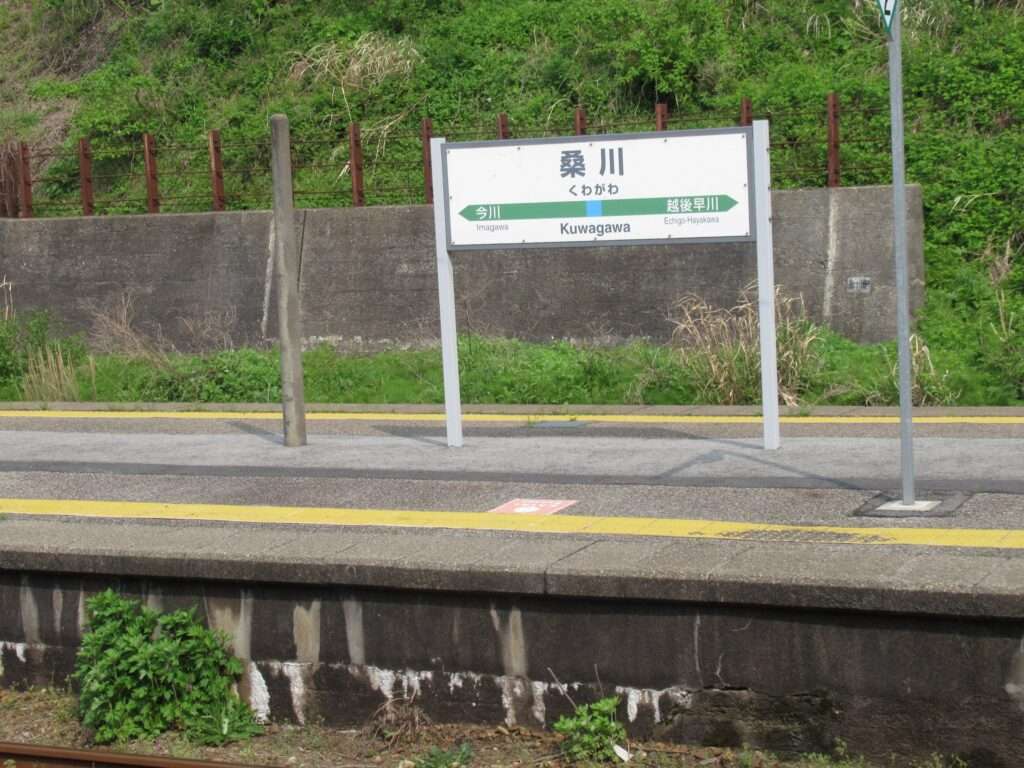 羽越本線の桑川駅でございます。越後早川駅まで複線電化、今川駅方面が単線電化となる区間にある単式島式複合型の2面3線、いわゆる国鉄型配線の地上駅で、駅舎は道の駅笹川流れ・夕日会館に併設されております。ホーム間は上屋付きの跨線橋で連絡しております。
