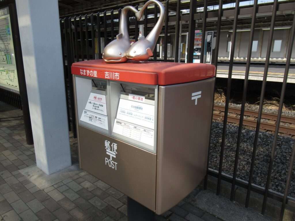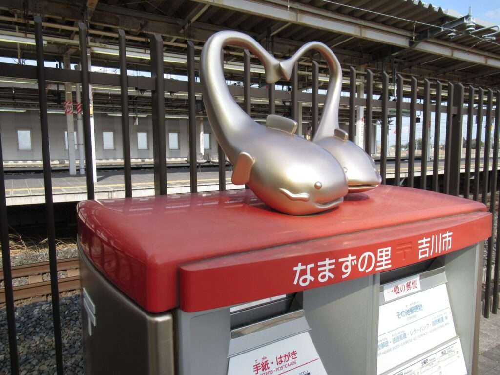 武蔵野線の吉川美南駅西口広場にあるご当地郵便ポストでございます。ナマズの里・吉川市でございます。2匹のナマズが尾でハートを形作っておりますっすよ、そこの奥さん(←何処の奥さん?)。
