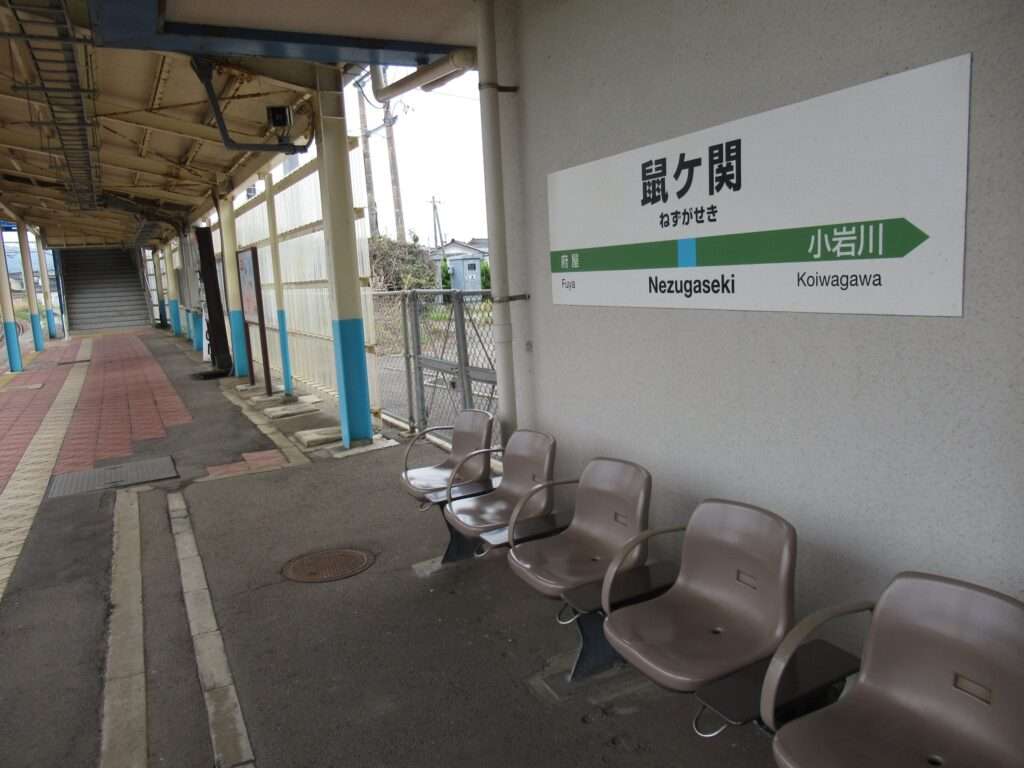 羽越本線の鼠ケ関駅でございます。複線電化区間にある単式島式複合型の2面3線、いわゆる国鉄型配線の地上駅で、平屋の駅舎がある無人駅となっております。ホーム間は上屋付きの跨線橋で連絡しております。山形県と新潟県の県境にございます。