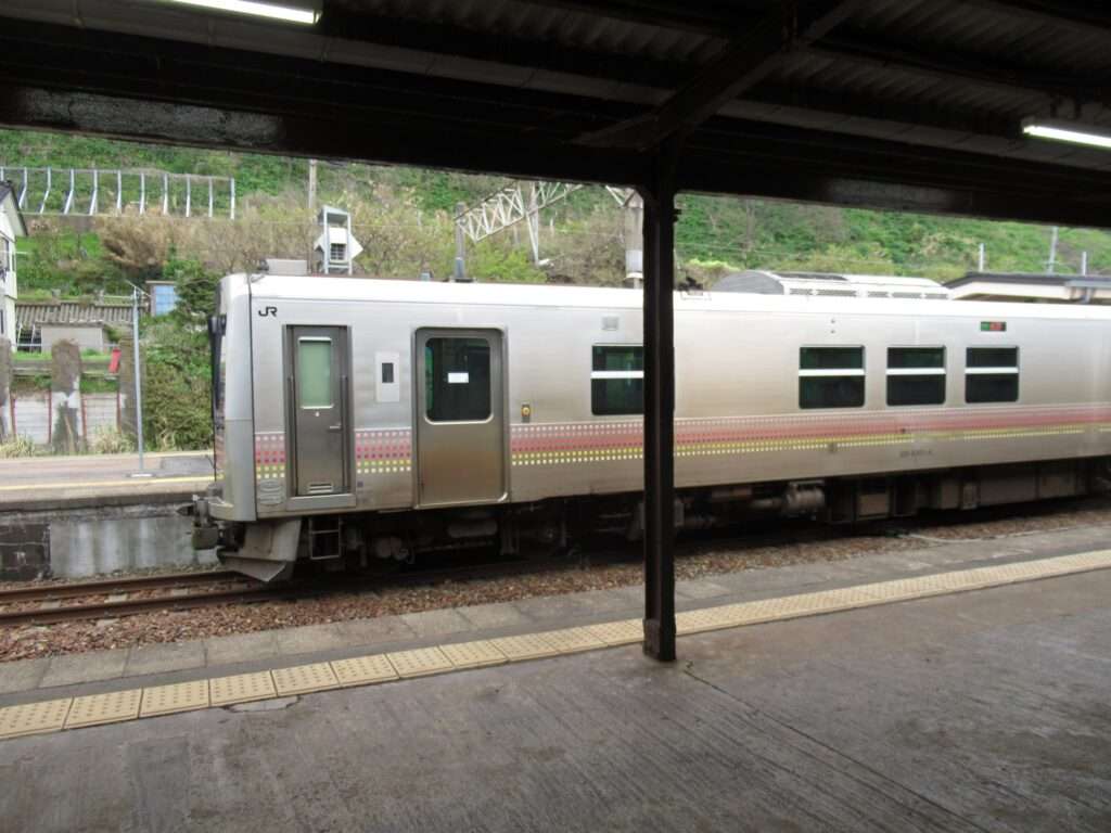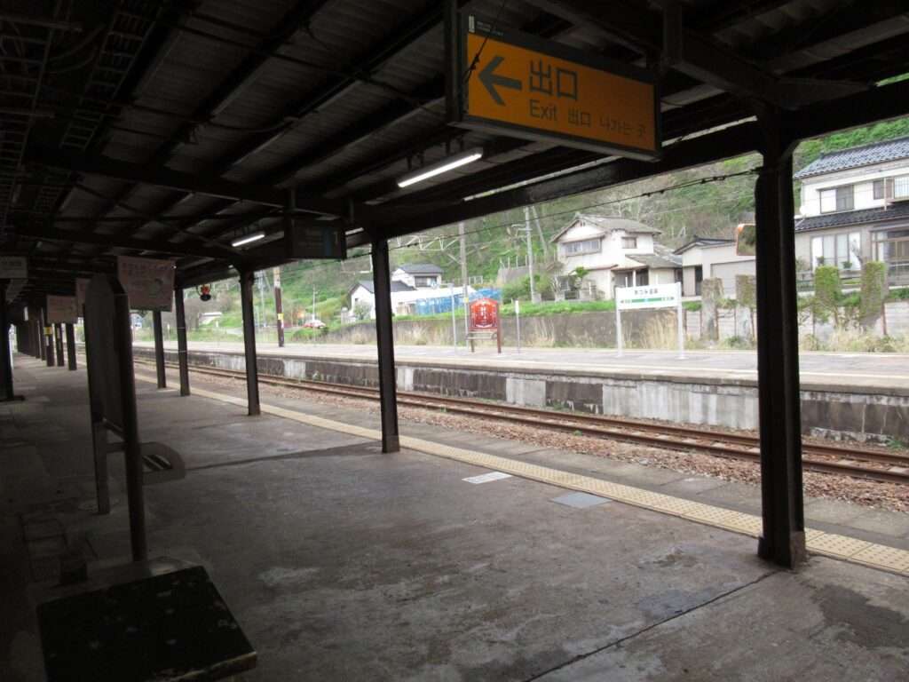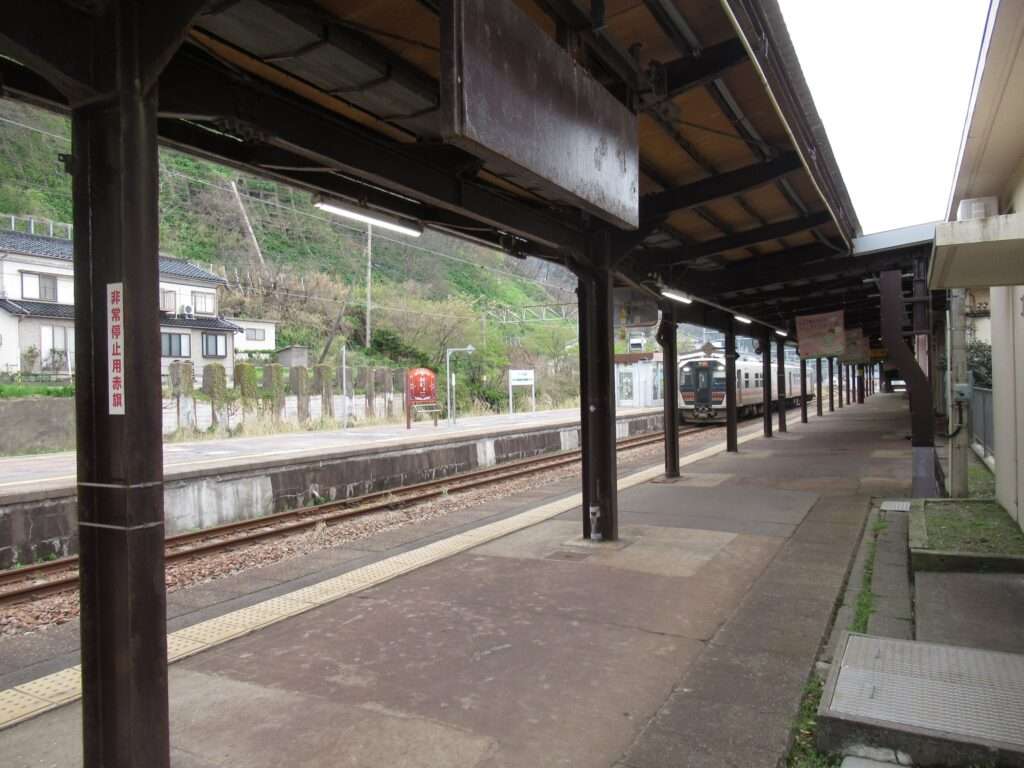 羽越本線のあつみ温泉駅でございます。小岩川駅まで単線電化、羽前大山駅まで複線電化となる区間にある単式島式複合型の2面3線、いわゆる国鉄型配線の地上駅で、平屋の駅舎がある業務委託駅となっております。ホーム間は地下道で連絡しております。駅からあつみ温泉までは約2kmほど離れております。