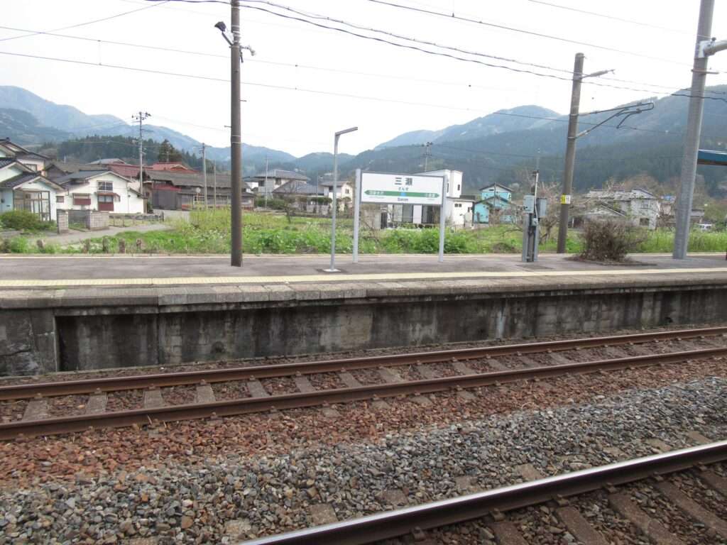 羽越本線の三瀬駅でございます。複線電化区間にある単式島式複合型の2面3線、いわゆる国鉄型配線の地上駅で、平屋の駅舎がある無人駅となっております。ホーム間は上屋付きの跨線橋で連絡しております。ここの駅名・地名も重箱読み的難易度でございますですな。