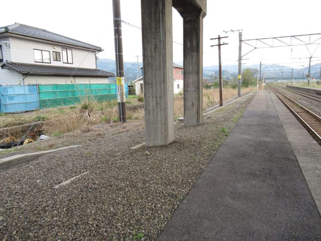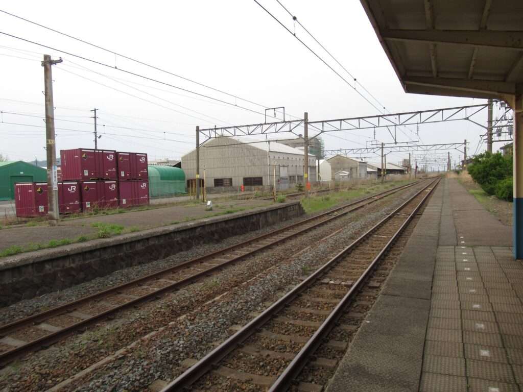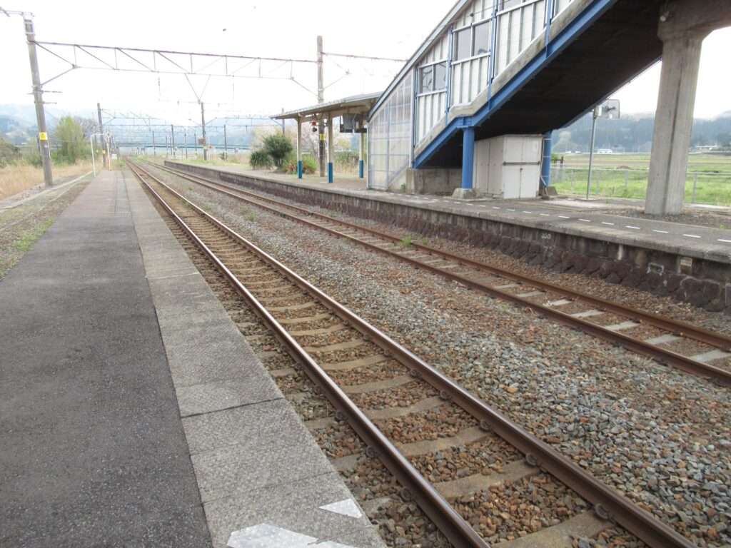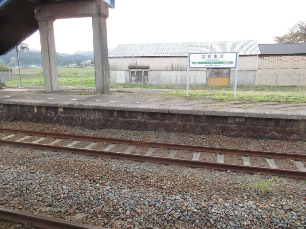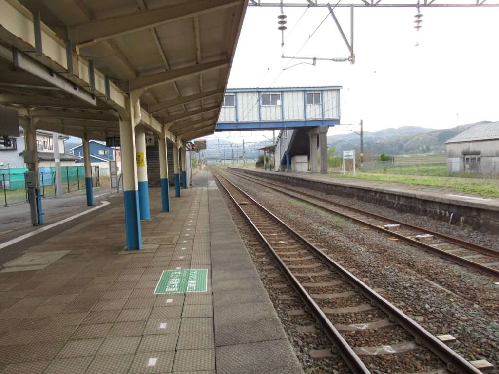 羽越本線の羽前水沢駅でございます。複線電化区間にある単式島式複合型の2面3線、いわゆる国鉄型配線の地上駅で、平屋の駅舎がある無人駅となっております。ホーム間は上屋付きの跨線橋で連絡しております。