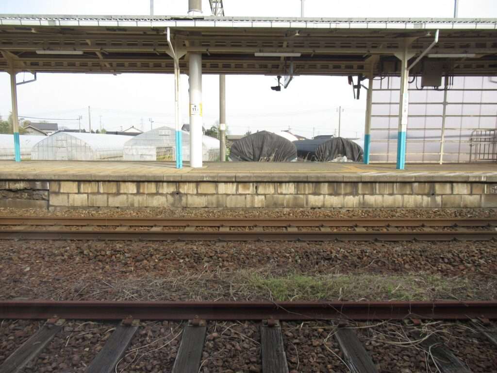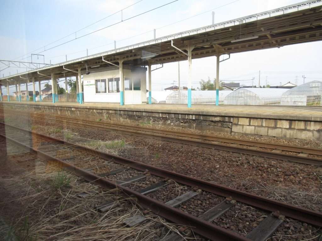 羽越本線の藤島駅でございます。本楯駅まで複線電化、羽前大山駅までが単線電化となる区間にある島式1面2線と、ホームのない側線が1本ある地上駅で、平屋の駅舎がある簡易委託駅となっております。駅舎からホームへは上屋付きの跨線橋で連絡しております。山形県立庄内農業高等学校などの最寄り駅となっております。