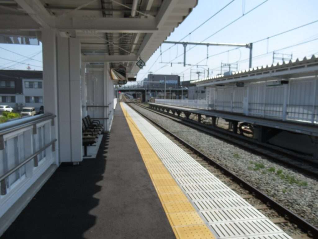 越後線の上所駅でございます。新潟駅まで複線電化、その他の区間は単線電化となる区間にある相対式2面2線の地上駅で、2025年(令和7年)3月に開業した新駅でございます。両ホームに出入口がある無人駅で、両ホーム間は改札外の地下道で連絡しております。新潟ユニゾンプラザ、新潟県立新潟南高等学校などの最寄り駅となっております。