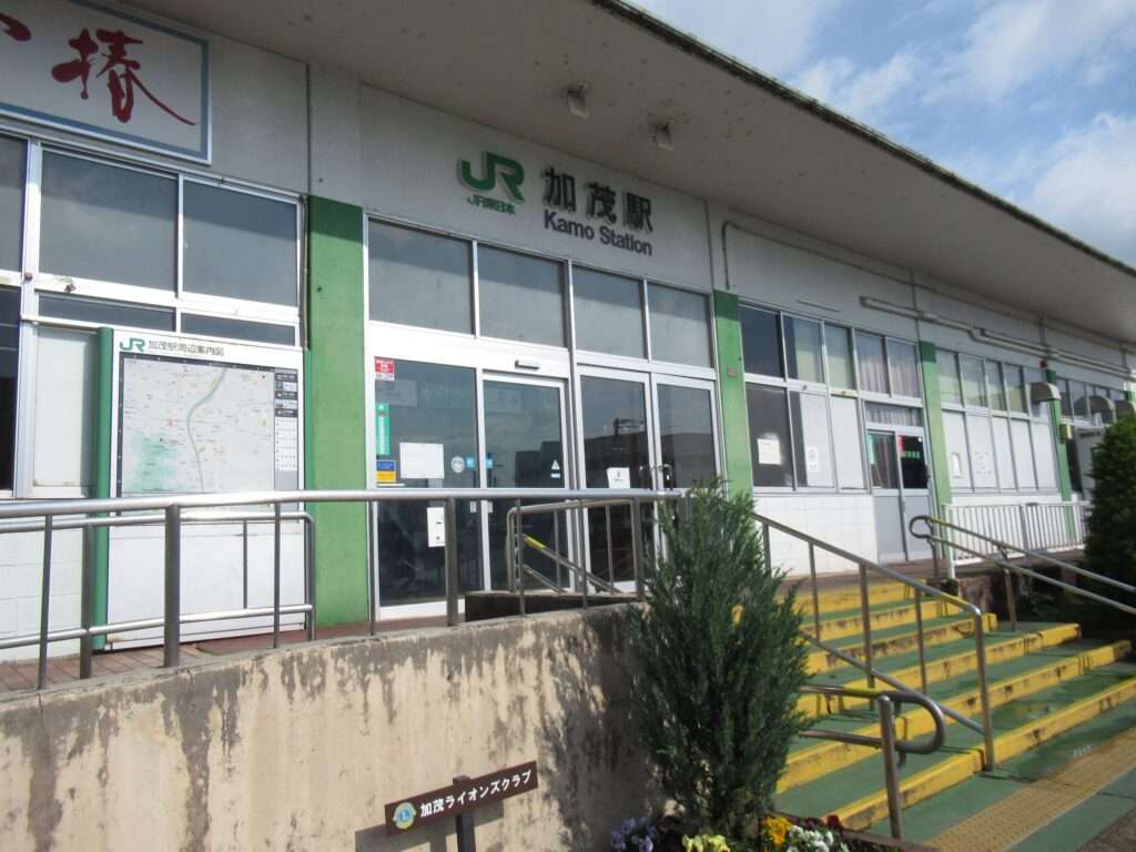 信越本線の加茂駅でございます。複線電化区間にある単式島式複合型の2面3線、いわゆる国鉄型配線だったうちの1線を廃止した相対式2面2線の地上駅で、東西に駅舎がある業務委託駅となっております。東西の駅舎とホームは地下道で連絡しております。1985年(昭和60年)に廃止された蒲原鉄道の駅舎が西口駅舎として存続しております。加茂市の中心駅で、新潟県立加茂農林高校、加茂暁星高校、新潟経営大学などの最寄り駅となっております。
