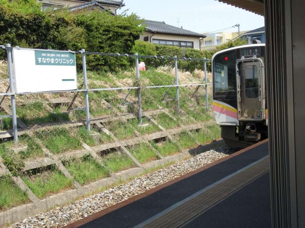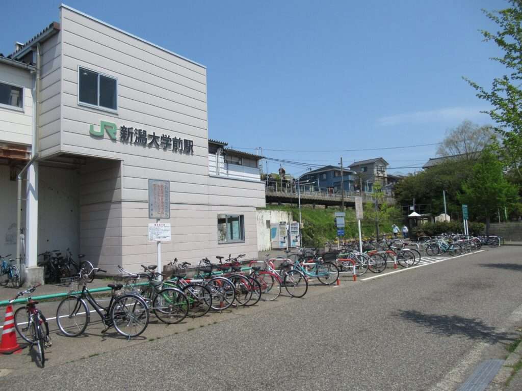 越後線の新潟大学前駅でございます。築堤上に敷設された単線電化区間にある地上駅で、単式1面1線の棒線駅となっております。斜面の築堤上であるためホームと駅前広場との間には高低差がございます。日本文理高等学校、新潟大学五十嵐キャンパス、新潟清心女子中学校・高等学校などの最寄り駅となっております。