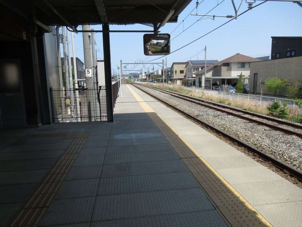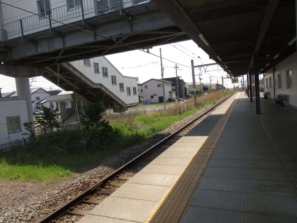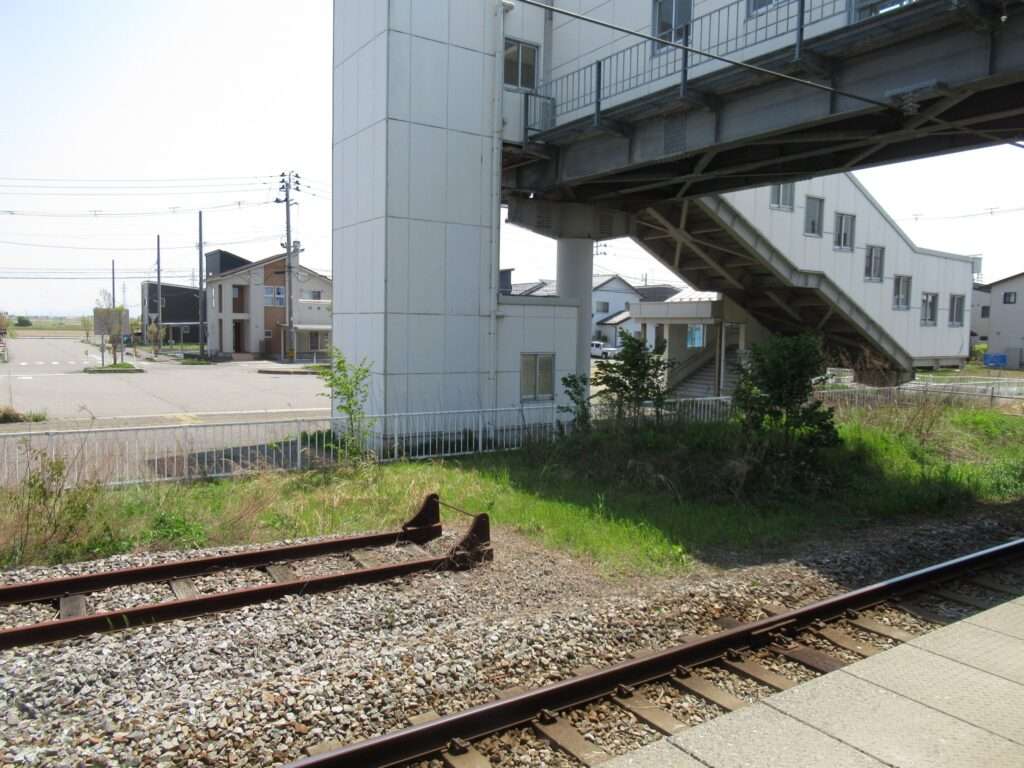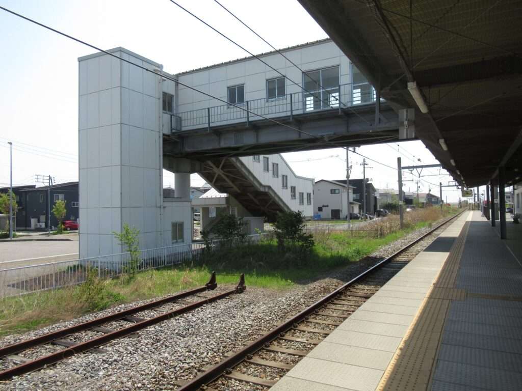越後線の内野西が丘駅でございます。単線電化区間にある地上駅で、単式1面1線とホームのない留置線1本がございます。簡易な駅舎がある無人駅で、線路を跨いでいる自由通路の跨線橋があり、将来的には相対式2面2線化と橋上駅化できる設計となっております。駅周辺に造成中の住宅地パレットタウン西新潟、新潟県立新潟西高等学校などの最寄り駅となっております。