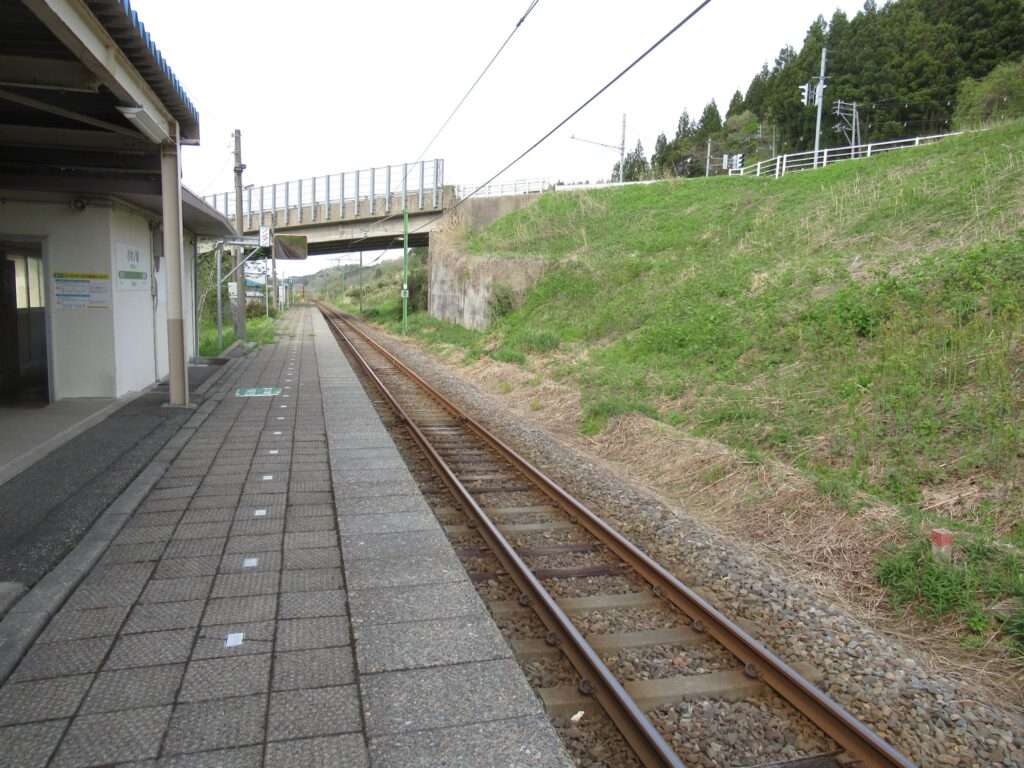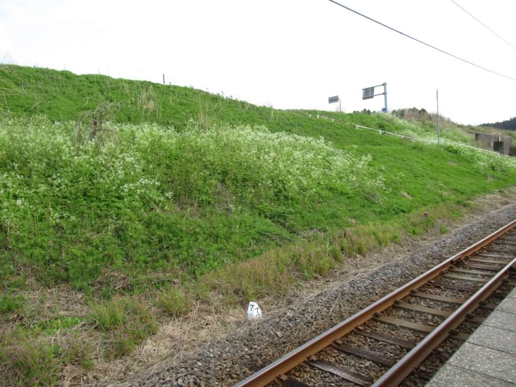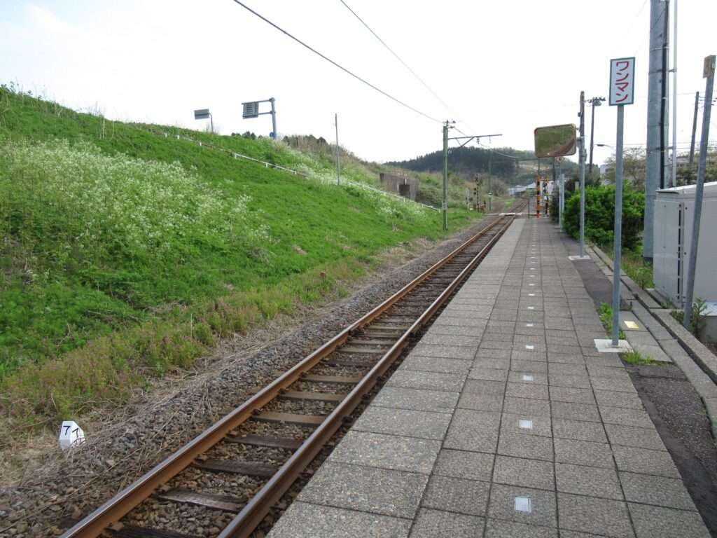 越後線の小木ノ城駅でございます。単線電化区間にある地上駅で、単式1面1線の棒線駅となっております。駅舎のない無人駅で、ホームに面して待合所が設置されております。