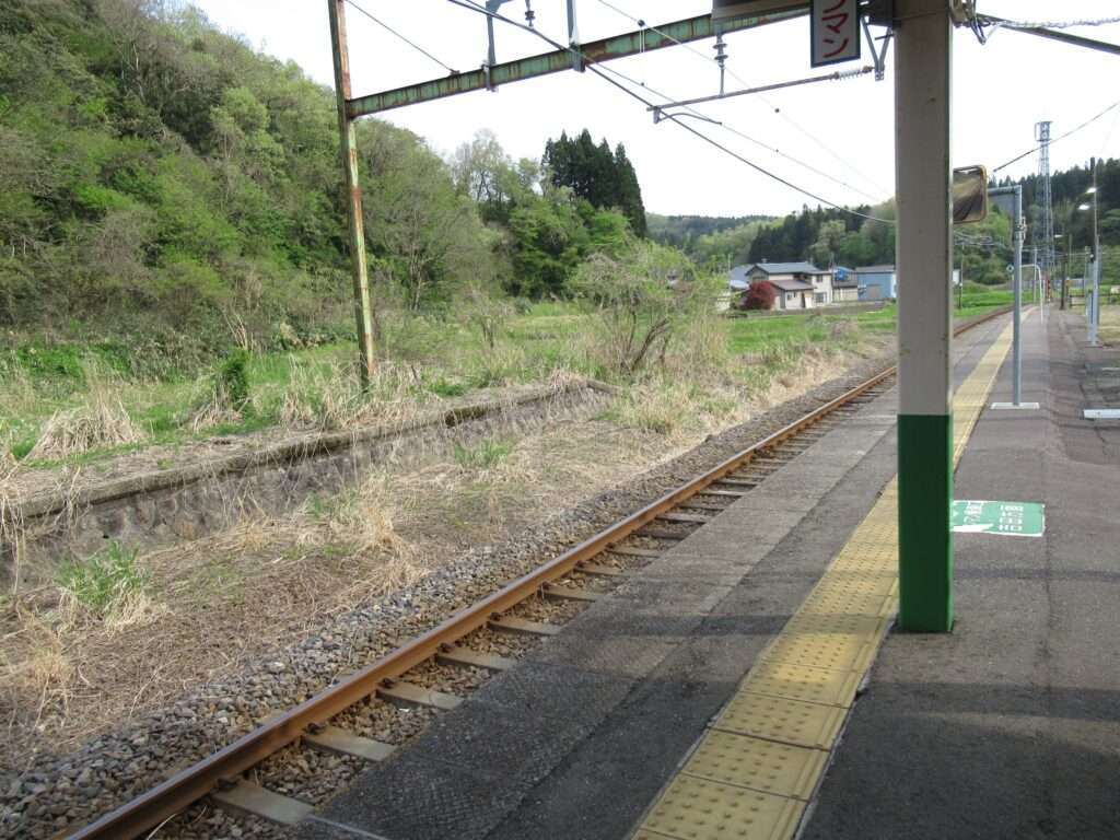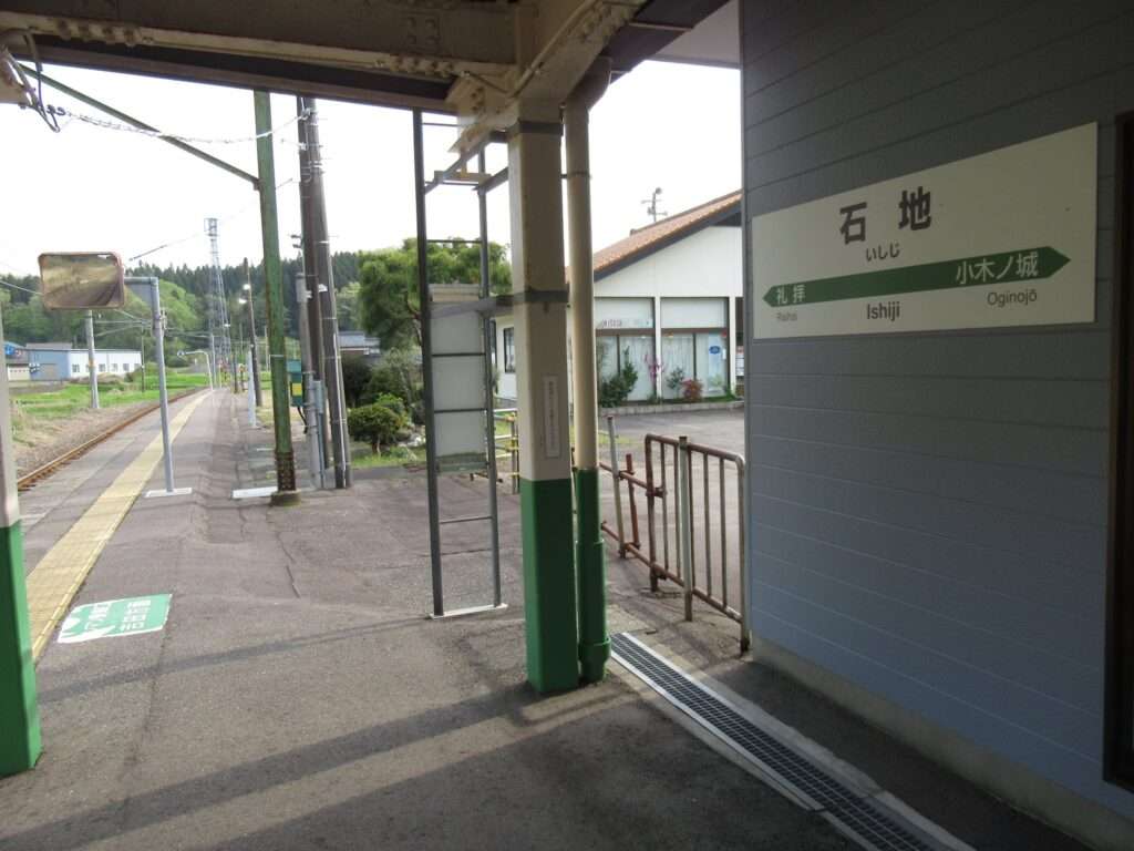 越後線の石地駅でございます。単線電化区間にある地上駅で、単式1面1線の棒線駅となっております。かつては相対式2面2線の列車交換可能な駅でしたが向かい側は廃止され、現在もホームは残っております。平屋の駅舎がある無人駅となっており、駅舎壁面には石地海水浴場のイラストが描かれております。