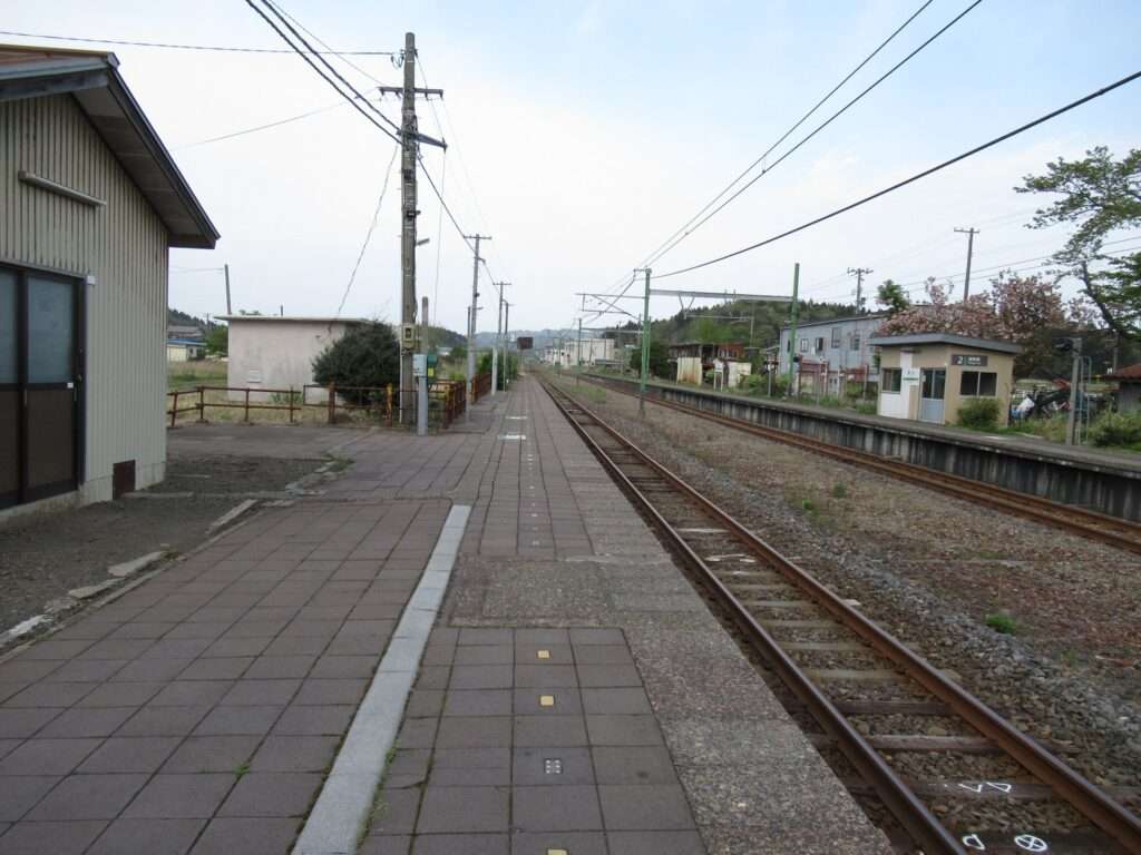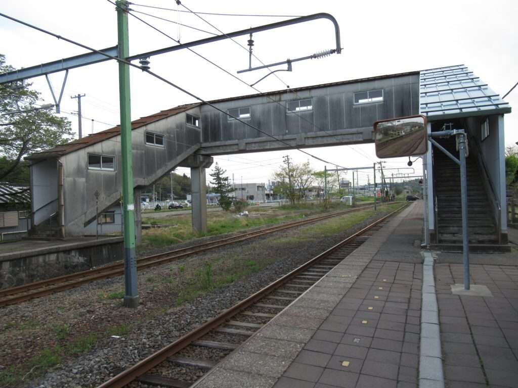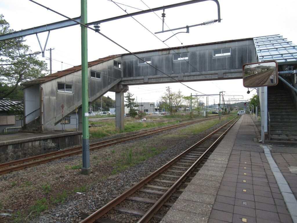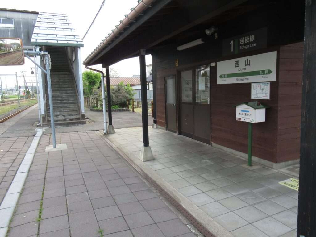 越後線の西山駅でございます。単線電化区間にある列車交換可能な相対式2面2線の地上駅で、ホーム間は上屋付きの跨線橋で連絡しております。工事車両用留置線がございます。ホーム間が広いのは、かつて中線があったためで、中線は越後線電化の際に架線柱を立てるために撤去されております。簡易な駅舎のある無人駅でございます。