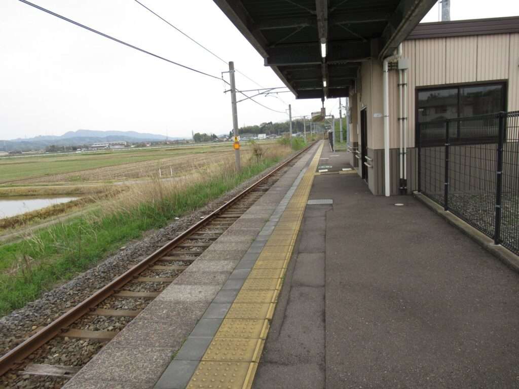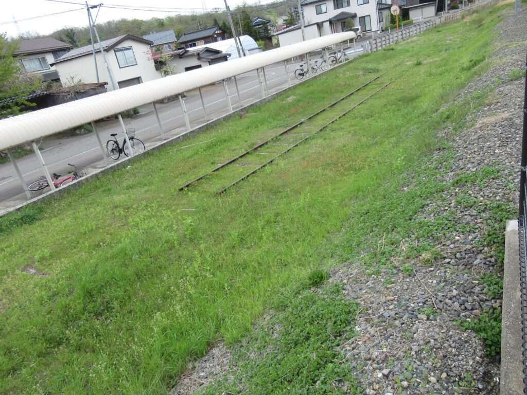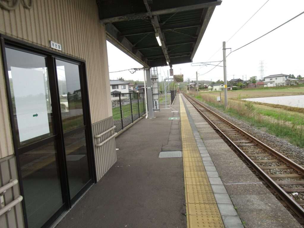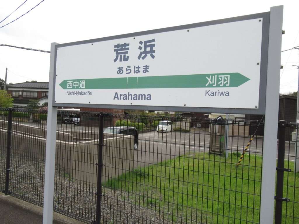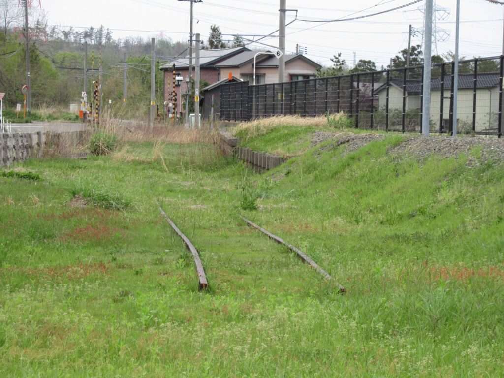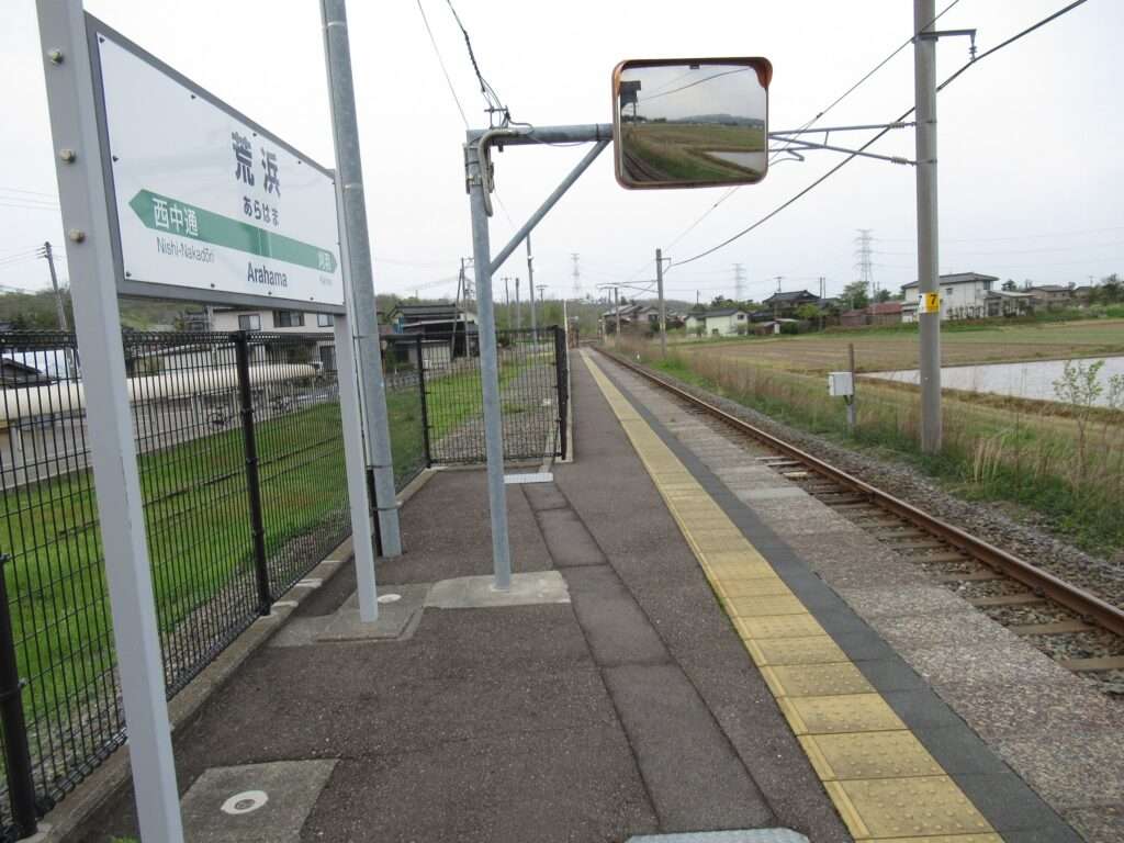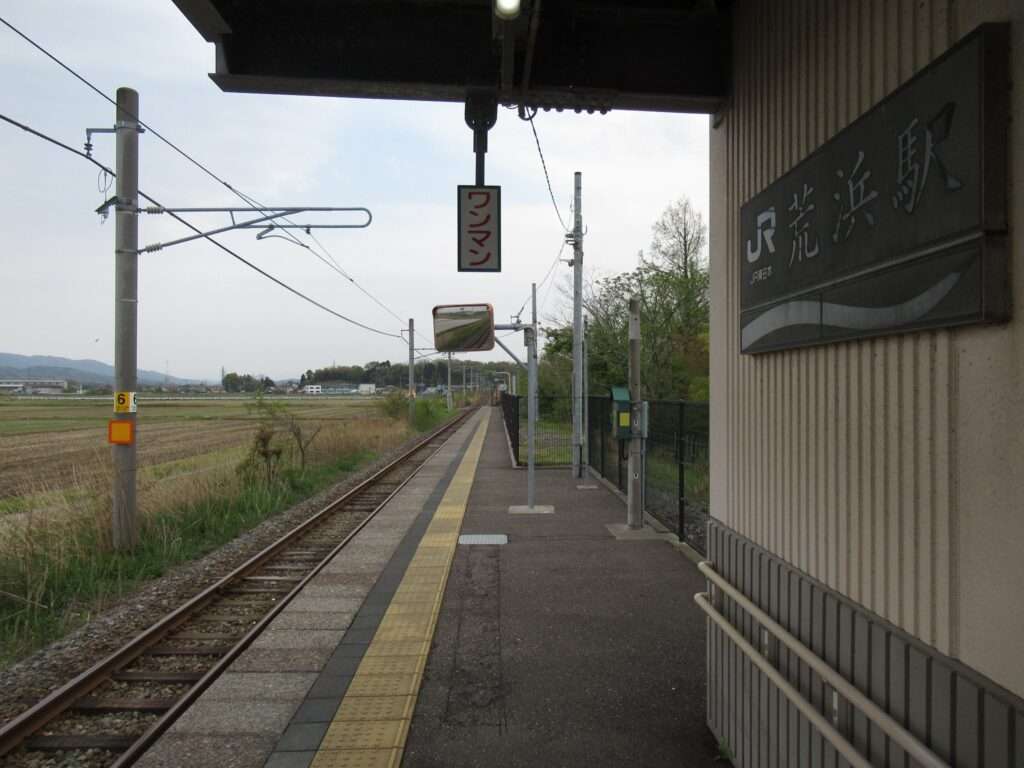 越後線の荒浜駅でございます。単線電化区間にある地上駅で、単式1面1線の棒線駅となっております。かつては列車交換可能な島式1面2線の駅で、草生した中にレールが残っております。平屋の駅舎がある無人駅となっております。