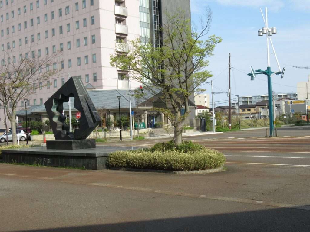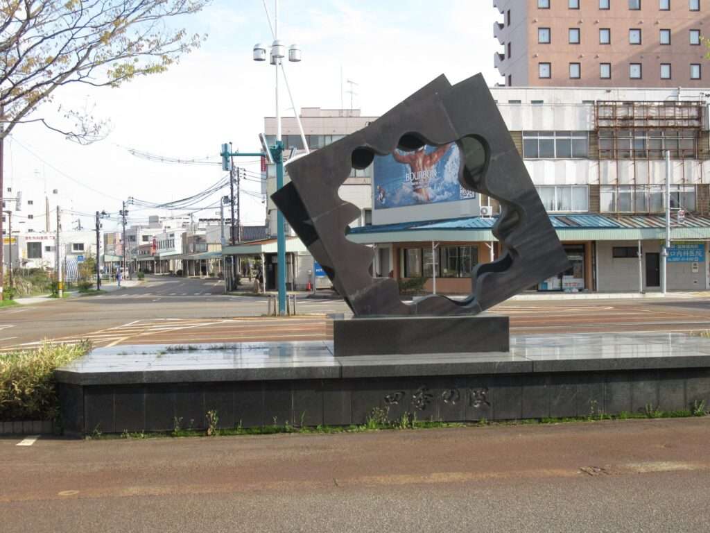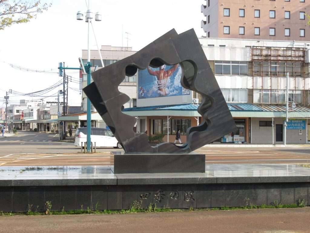 柏崎駅前にある石造りモニュメント、四季の波でございます。駅から海まで続く駅前通りを柏崎街角美術館として飾り付ける事業で設置されたものだそうで。製作者は原益夫さんとクレジットされておりました。四角形が四季を表し、中央をくり抜いた日本海の波を表している造形でございますね、そこの奥さん(←何処の奥さん?)。
