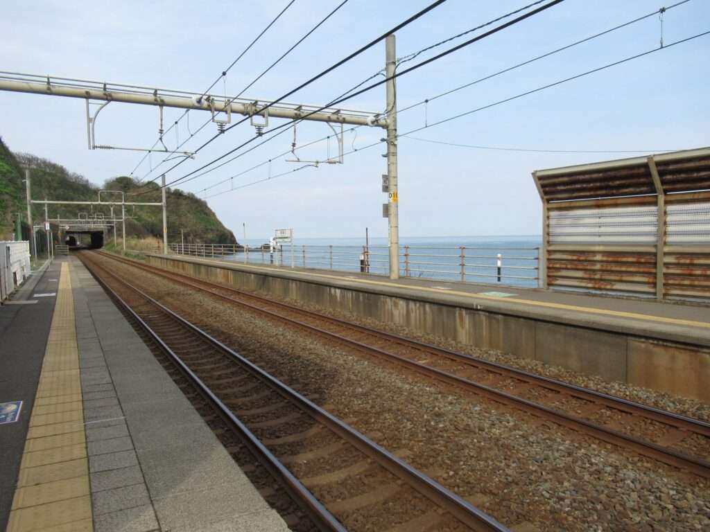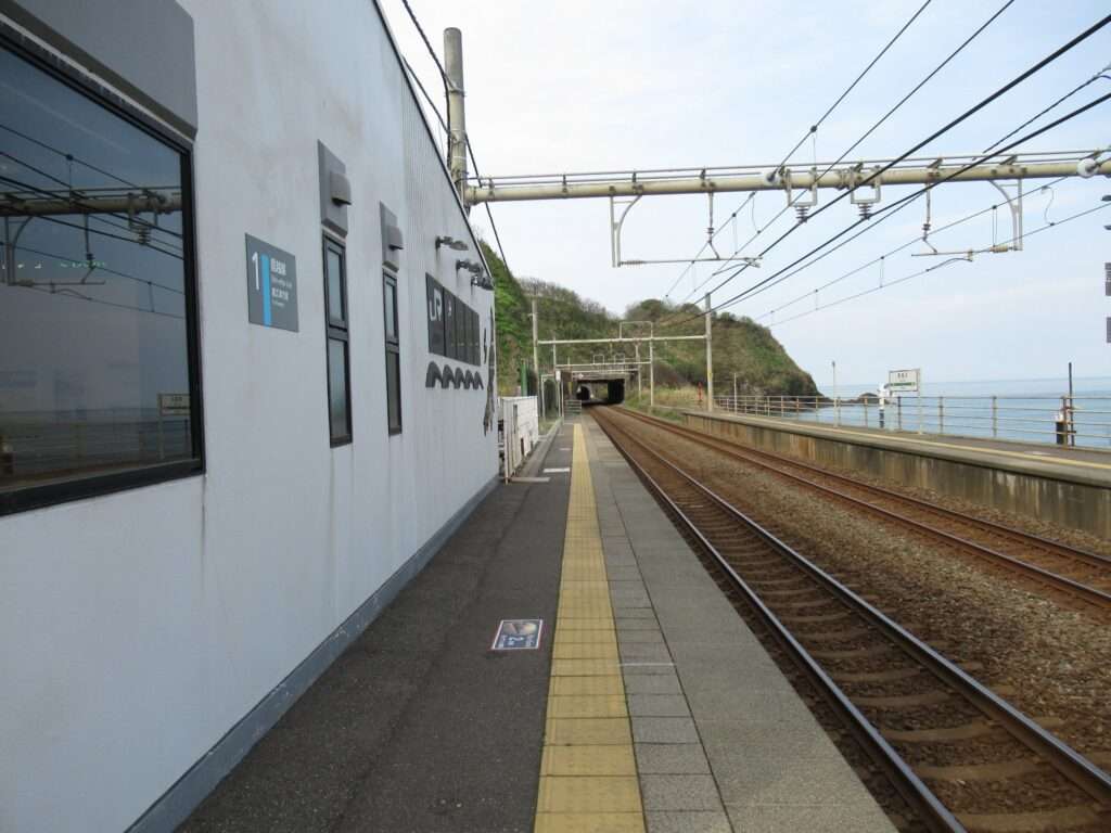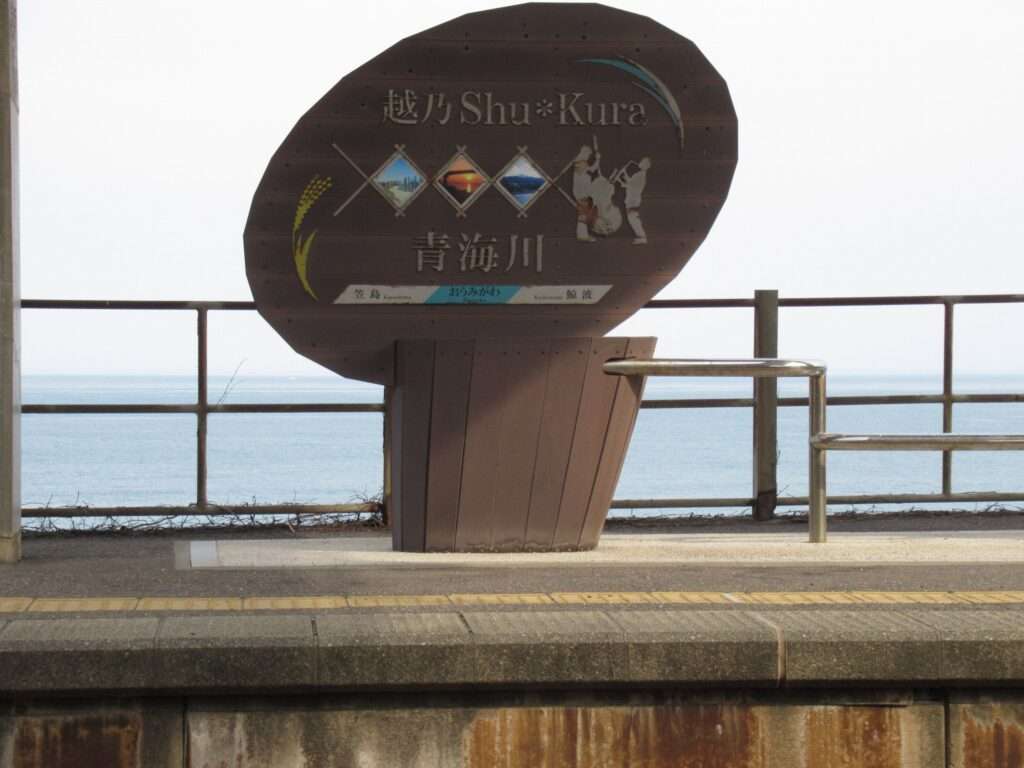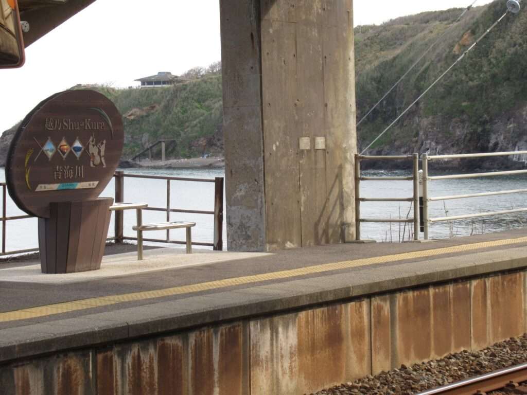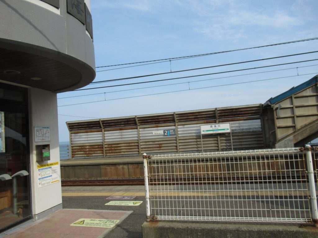 信越本線の青海川駅でございます。複線電化区間にある相対式2面2線の地上駅で、ユニークな形状の簡易な駅舎がある無人駅となっております。ホーム間は上屋付きの跨線橋で連絡しております。「日本一海に近い所にある駅」の一つでございます。ホームからの眺めは絶景で、特に夕日が沈む光景は日本一美しいとされております。
