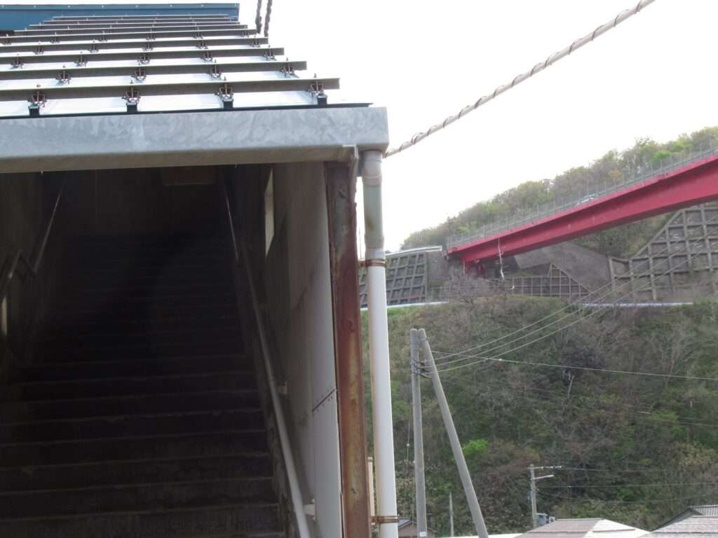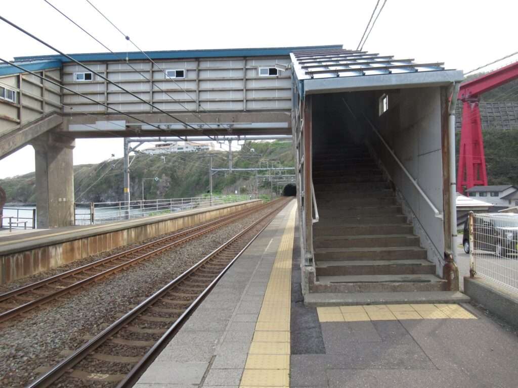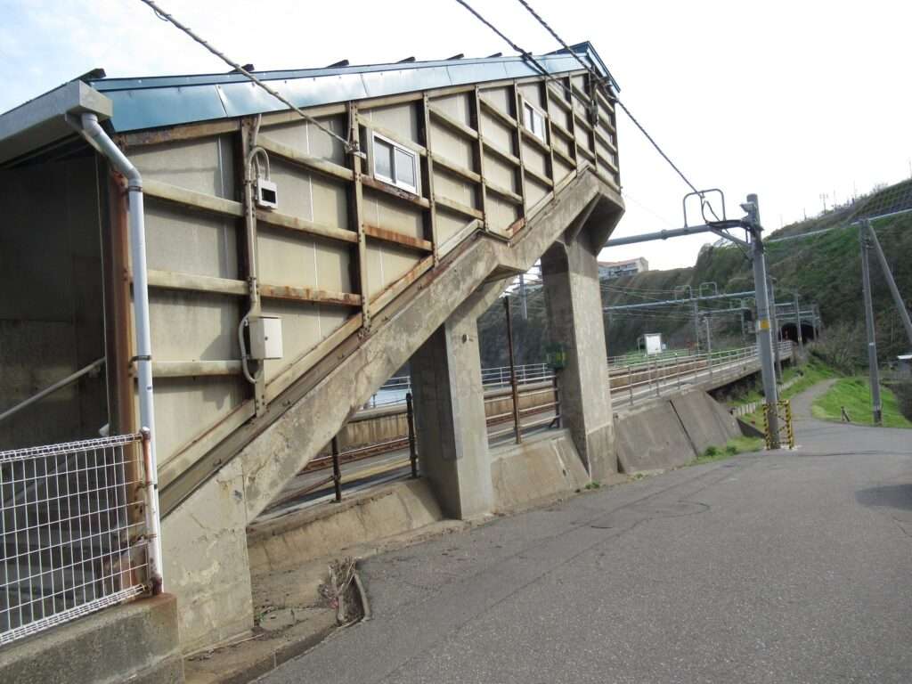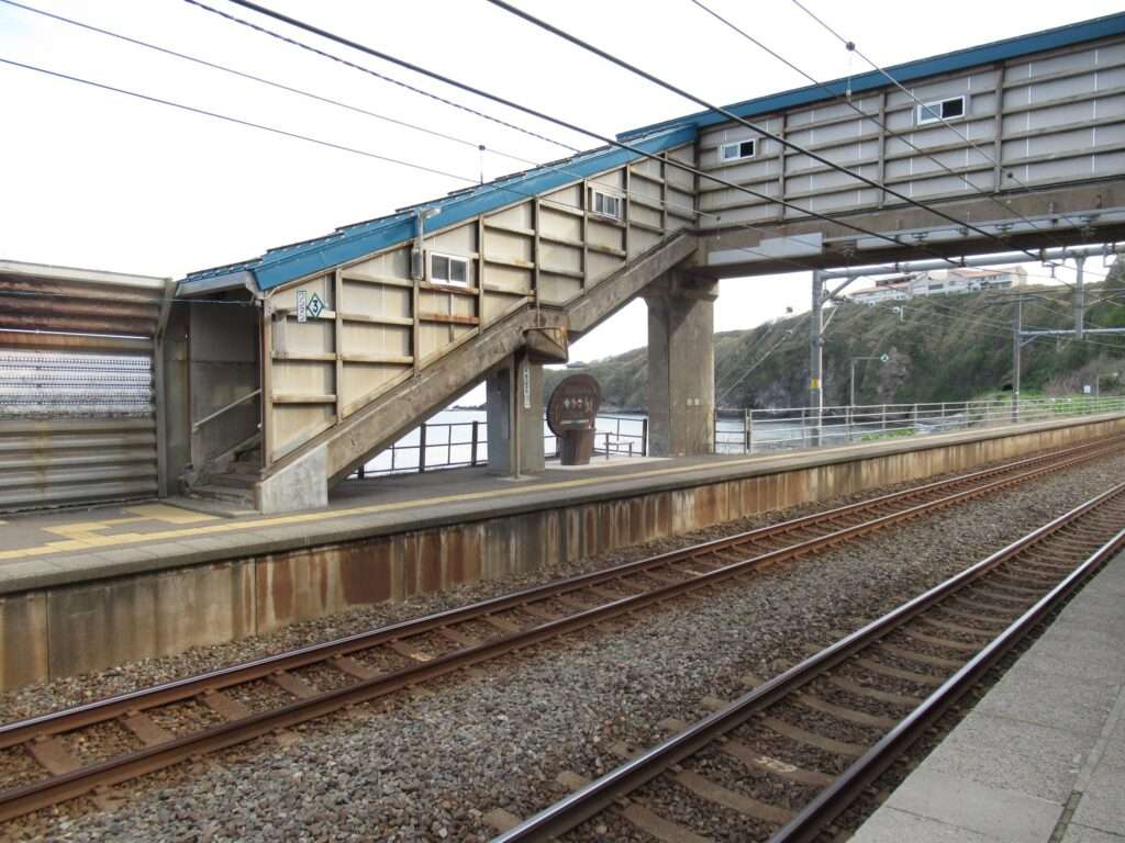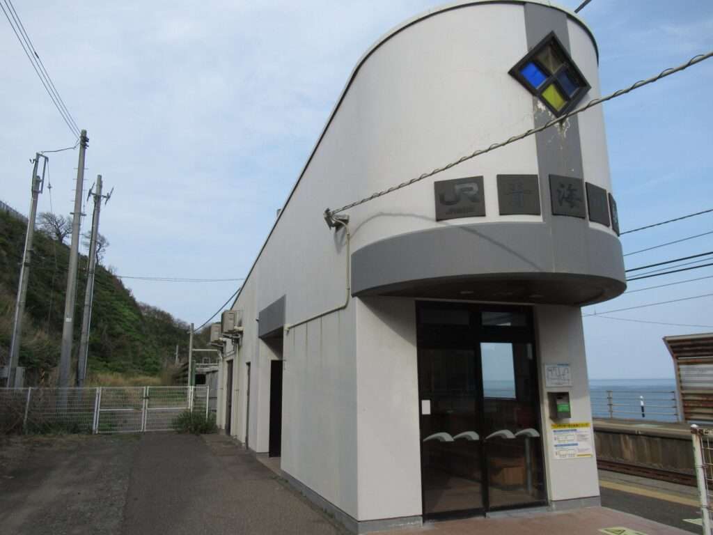 信越本線の青海川駅でございます。複線電化区間にある相対式2面2線の地上駅で、ユニークな形状の簡易な駅舎がある無人駅となっております。ホーム間は上屋付きの跨線橋で連絡しております。「日本一海に近い所にある駅」の一つでございます。ホームからの眺めは絶景で、特に夕日が沈む光景は日本一美しいとされております。